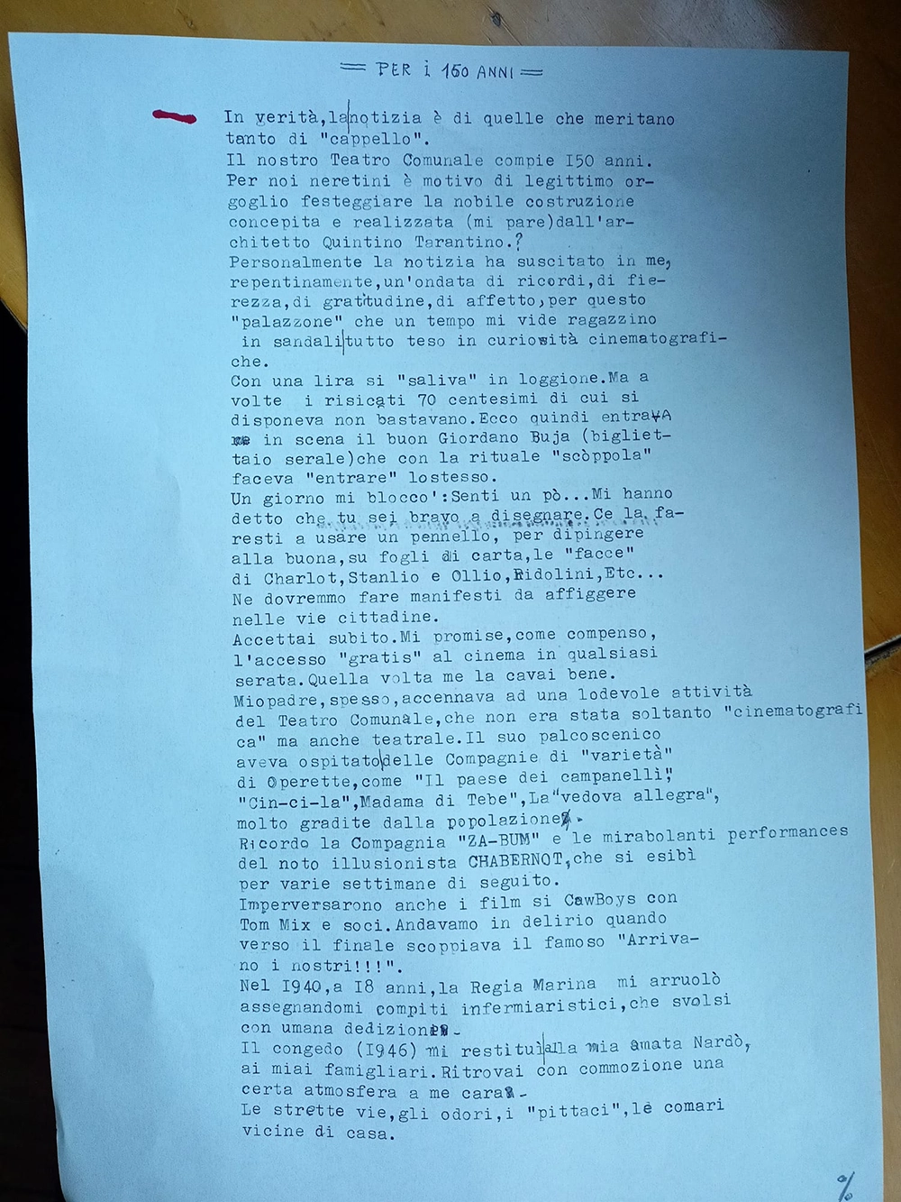 «In verità», esordisce Arturo Presta, «la notizia è di quelle che meritano tanto di… “cappello”. Il nostro Teatro Comunale compie 150 anni. Per noi neritini è motivo di legittimo orgoglio festeggiare la nobile costruzione concepita e realizzata (mi pare) dall’architetto Quintino Tarantino. Personalmente, la notizia ha suscitato in me, repentinamente, un’ondata di ricordi, di fierezza, di gratitudine, di affetto, per questo “palazzone” che un tempo mi vide ragazzino in sandali tutto teso in curiosità cinematografiche. Con una lira si “saliva” in loggione. Ma, a volte, i risicati 70 centesimi di cui si disponeva non bastavano. Ecco, quindi, entrava in scena il buon Giordano Buja (bigliettaio serale) che, con la rituale “scòppula”, faceva entrare ugualmente. Un giorno mi bloccò e mi disse: “Senti un po’…mi hanno detto che tu sei bravo a disegnare, ce la faresti a usare un pennello per dipingere, alla buona, su fogli di carta le “facce” di Charlot, Stanlio e Ollio, Ridolini etc…, ne dovremmo fare manifesti da affiggere nelle vie cittadine. Accettai subito. Mi promise, come compenso, l’accesso “gratis” al cinema in qualsiasi serata. Quella volta me la cavai bene».