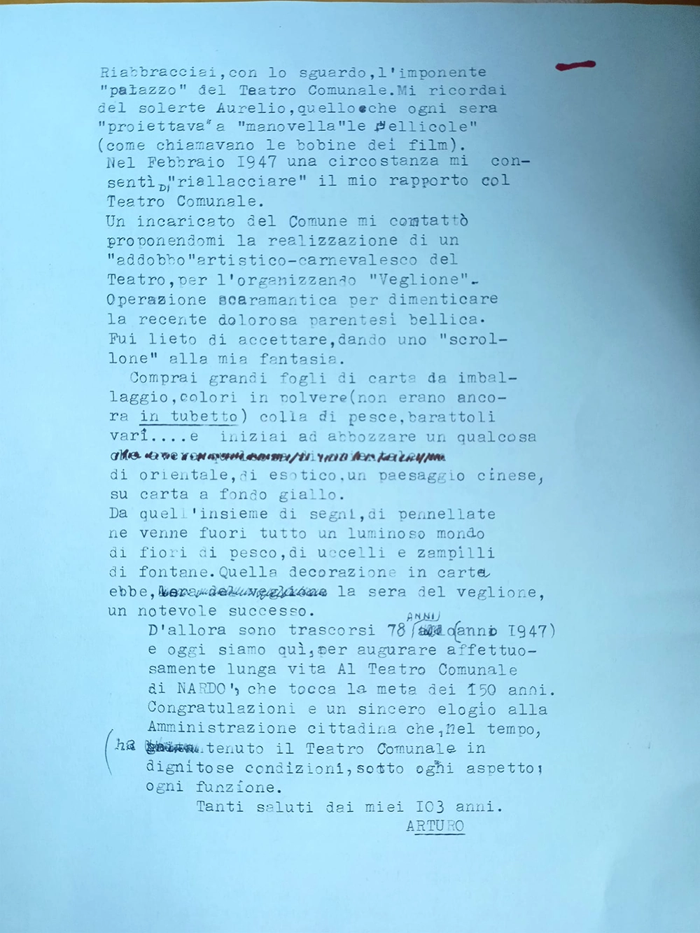 «Nel 1940, a 18 anni, la Regia Marina mi arruolò assegnandomi compiti infermieristici, che svolsi con umana dedizione. Il congedo (1946) mi restituì alla mia amata Nardò, ai miei familiari. Ritrovai con commozione una certa atmosfera a me cara. Le strette vie, gli odori, i “pittàci”, le comari vicine di casa. Riabbracciai, con lo sguardo, l’imponente “palazzo” del Teatro Comunale. Mi ricordai del solerte Aurelio, quello che ogni sera, “proiettava” a “manovella” le pellicole (come chiamavano le bobine dei film). Nel Febbraio del 1947, una circostanza mi consentì di “riallacciare” il mio rapporto col Teatro Comunale. Un incaricato del Comune mi contattò, proponendomi la realizzazione di un “addobbo” artistico-carnevalesco del Teatro, per l’organizzando “Veglione”. Operazione scaramantica per dimenticare la recente dolorosa parentesi bellica. Fui lieto di accettare dando uno “scrollone” alla mia fantasia. Comprai grandi fogli di carta da imballaggio, colori in polvere (non erano ancora in tubetto), colla di pesce, barattoli vari … e iniziai ad abbozzare un qualcosa di orientale, di esotico, un paesaggio cinese su carta a fondo giallo. Da quell’insieme di segni, di pennellate, ne venne fuori tutto un luminoso mondo di fiori di pesco, di uccelli e zampilli di fontane. Quella decorazione in carta ebbe, la sera del Veglione, un notevole successo. D’allora sono trascorsi 78 anni (anno 1947) e oggi siamo qui, per augurare affettuosamente lunga vita al Teatro Comunale di Nardò, che tocca la meta dei 150 anni. Congratulazioni e un sincero elogio all’Amministrazione cittadina che, nel tempo, ha tenuto il Teatro Comunale in dignitose condizioni, sotto ogni aspetto, ogni funzione. Tanti saluti dai miei 103 anni. Arturo».