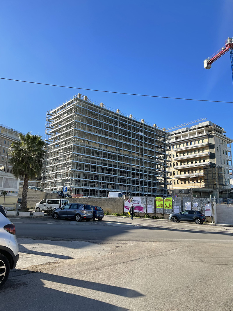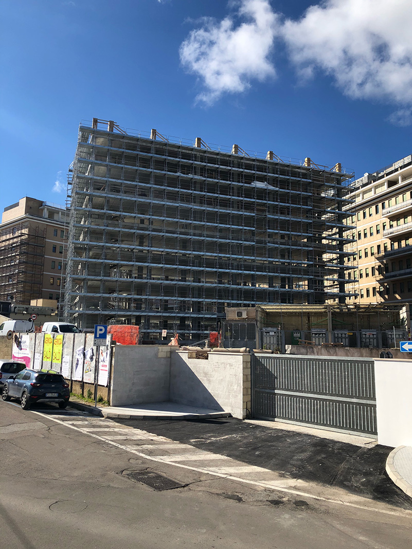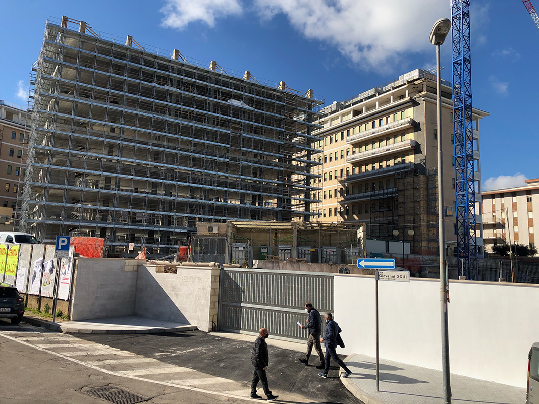 È visibile dall’esterno la dimensione della nuova struttura ancora ricoperta dalle impalcature degli operai. Chiediamo lumi all’ingegnere Coppola: «Si stanno realizzando ben 40mila nuovi metri cubi di costruzione, oltre 10mila metri quadrati di pavimento, il 30% in più della struttura esistente, da destinare ad uffici, depositi, movimentazione merci, farmacia, nuovo CUP (Centro Unico di Prenotazione), nuovi laboratori di analisi, nuovo centro emotrasfusionale, nuovi ambulatori, nuovi ambienti destinati alla degenza (il numero massimo di ricoveri resterà uguale ma saranno razionalizzate e migliorate le degenze)».