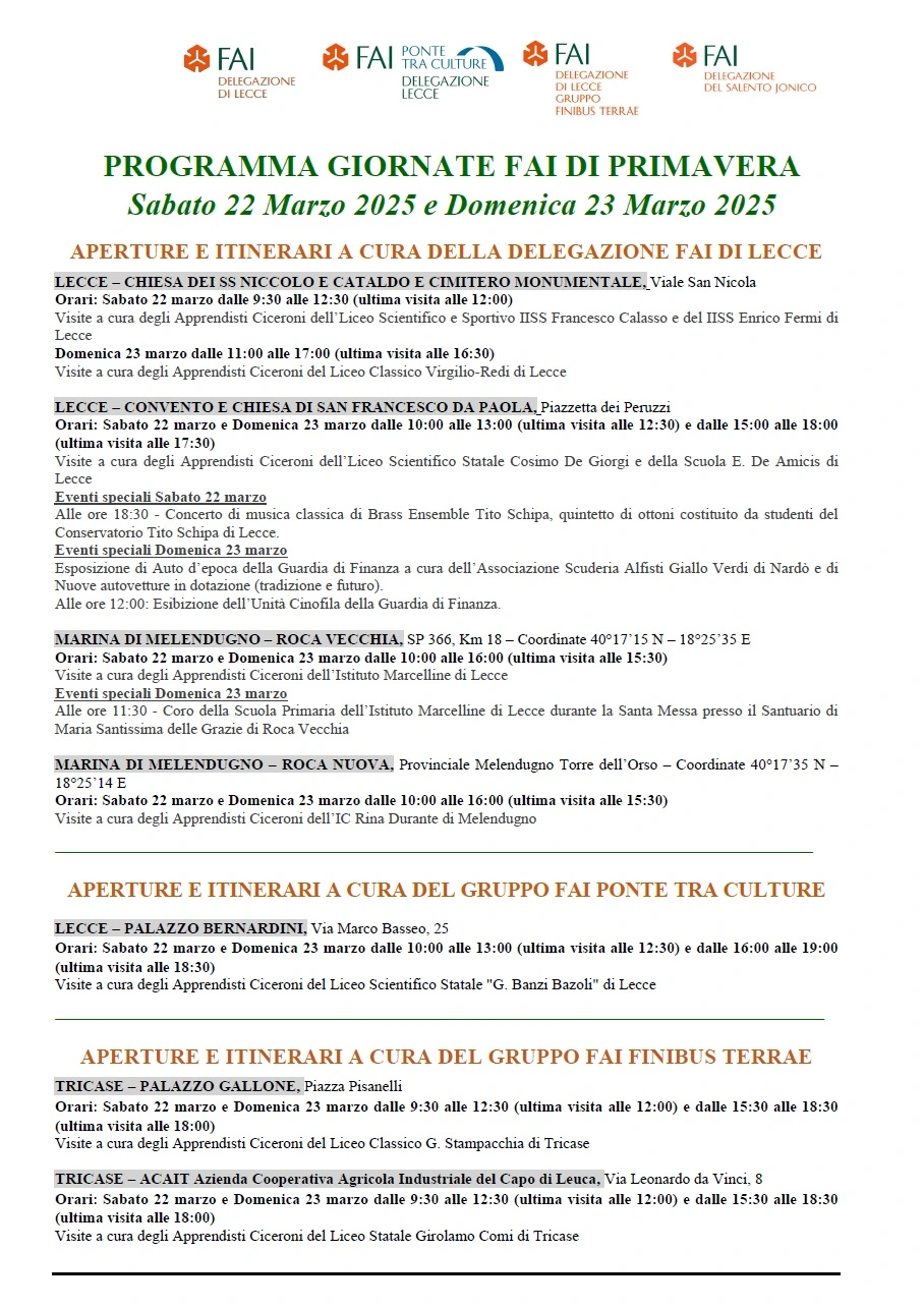 La Delegazione FAI di Lecce, il Gruppo Fai Ponte tra Culture, il Gruppo Finibus Terrae e la Delegazione del Salento Jonico consentiranno la visita al pubblico di 22 Luoghi, toccando ben 14 località salentine e coinvolgendo gli studenti di 26 Istituti scolastici oltre agli studenti della Facoltà di Beni Culturali di Lecce.