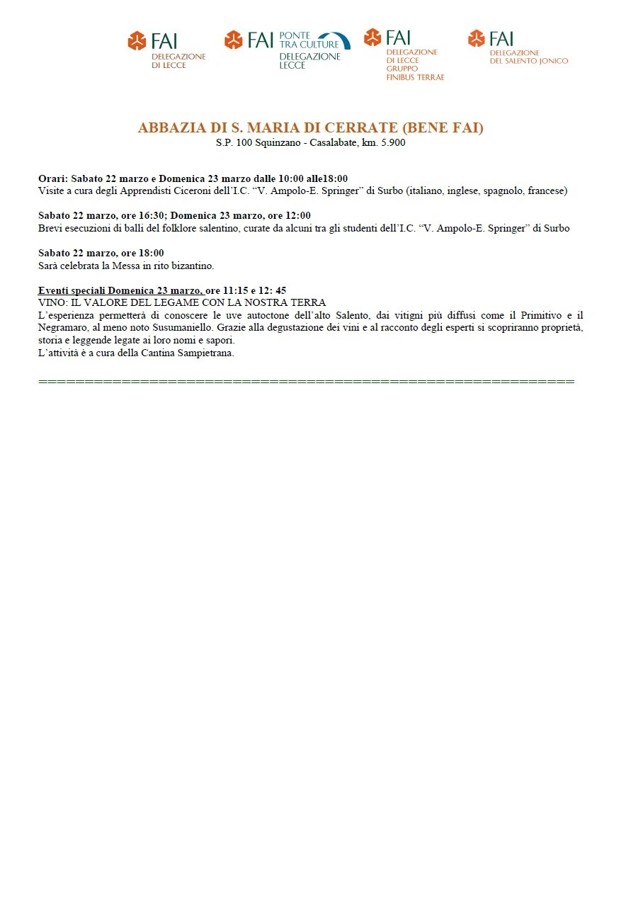 A questo fitto programma, si aggiunge, naturalmente, l’apertura del Bene FAI dell’Abbazia di Santa Maria di Cerrate e i suoi eventi speciali organizzati per l’occasione e la visita alla Chiesa dei S.S. Niccolò e Cataldo, Bene aperto tutto l’anno grazie al lavoro dei Volontari FAI.