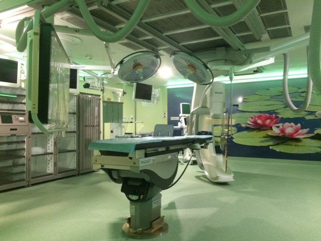 La sala operatoria ibrida è stata appositamente progettata per consentire i vari trattamenti sopra descritti. Essa dispone di un teatro di 80 mq, adiacente al blocco operatorio a cui è collegata. E’ dotata di: