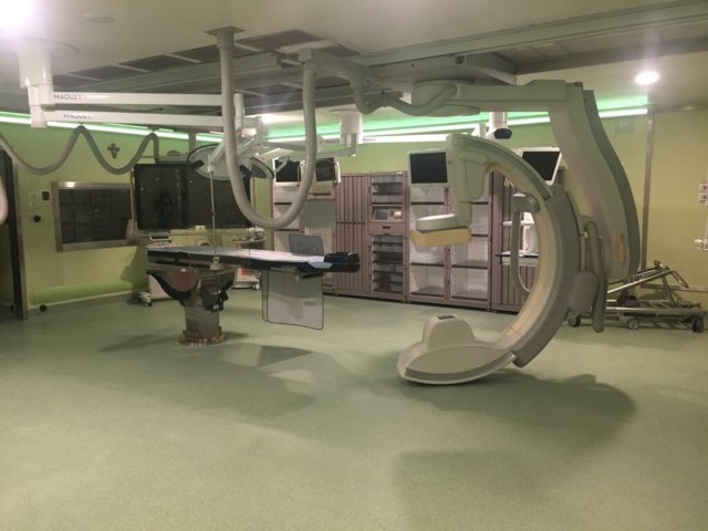 Sistema angiografico Philips 3D monoplananare digitale integrato con flat detector a grande campo e sistema ClarityIQ per la riduzione della dose radiologica, unico tavolo operatorio Magnus Maquet interoperabile sincronizzato con sistema angiografico dotato di piani in fibra di carbonio e chirurgico, equipaggiamento chirurgico (scialitica posizionata ai lati del binario dell’angiografo con satellite e corpo lampada Maquet a bracci lunghi e ulteriori bracci per il montaggio sino ad 8 monitor medicali, apparecchio per anestesia e stativi per chirurgo ed anestesista con utenze elettriche gas e dati),display da 56’’con multiview sino ad 8 segnali in ambiente paziente e monitor medicali a parete per rendere disponibili molteplici informazioni “at a glance” (anche provenienti dai sistemi informatici) utili a tutti gli operatori presenti, siano essi circolanti o non circolanti.