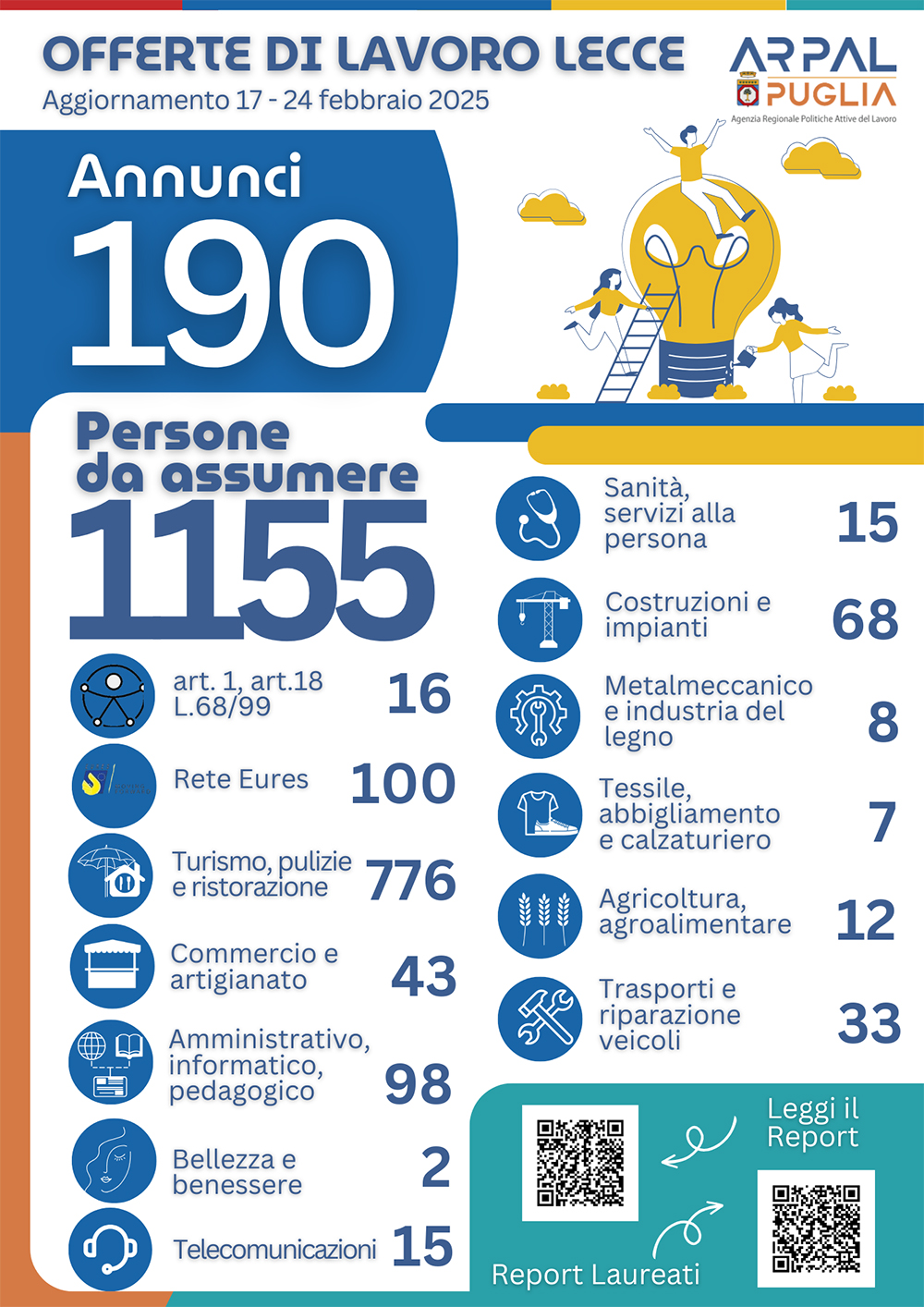 Le offerte di lavoro crescono quasi del dieci per cento rispetto alla scorsa settimana: il 6° Report settimanale, elaborato dall’Ambito di Lecce di Arpal Puglia, conta 190 annunci, per un totale di 1.155 posti di lavoro in diversi settori.