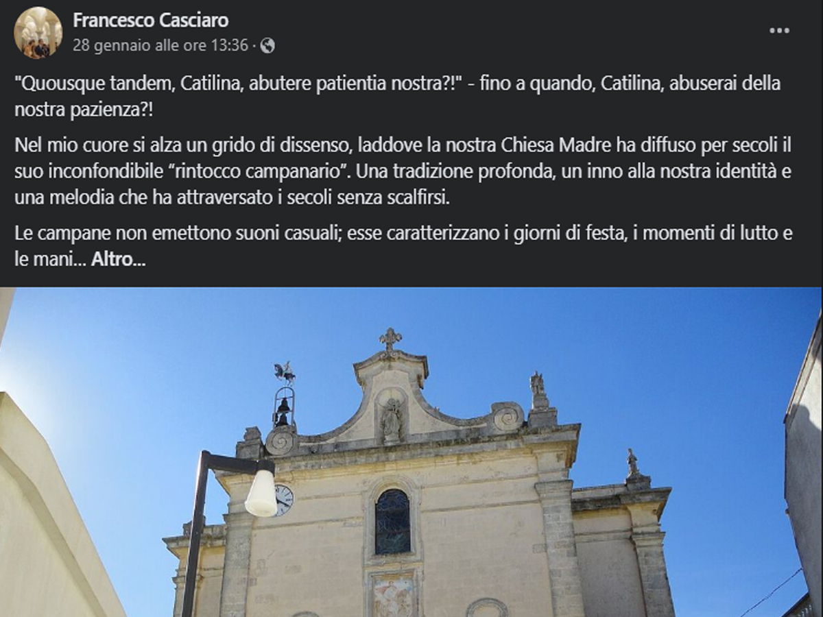 Di seguito le motivazioni di Francesco Casciaro che appoggia la battaglia intrapresa dal parroco, don Giovanni, in difesa delle “sue” campane.