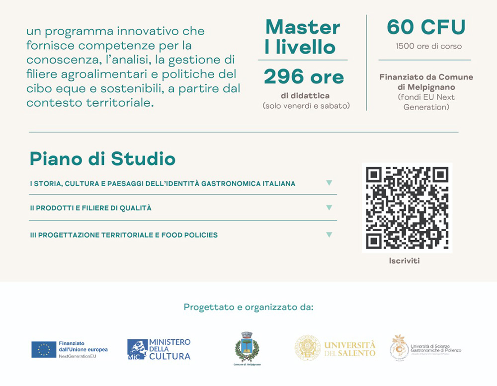 “L’offerta didattica è di altissimo livello, anche perché il Master è a doppio titolo, essendo sviluppato in collaborazione con l’Università di Scienze Gastronomiche di Pollenzo (massima autorità culturale su questi temi, in Europa) e con Slow Food. E il corso si svolge nello splendido Palazzo Marchesale di Melpignano, nel contesto del nuovo Melpignano Food Lab. È certamente un’occasione da non perdere, per chi vuole maturare una specializzazione di alto profilo in questo settore, anche perché questa prima edizione è completamente gratuita».