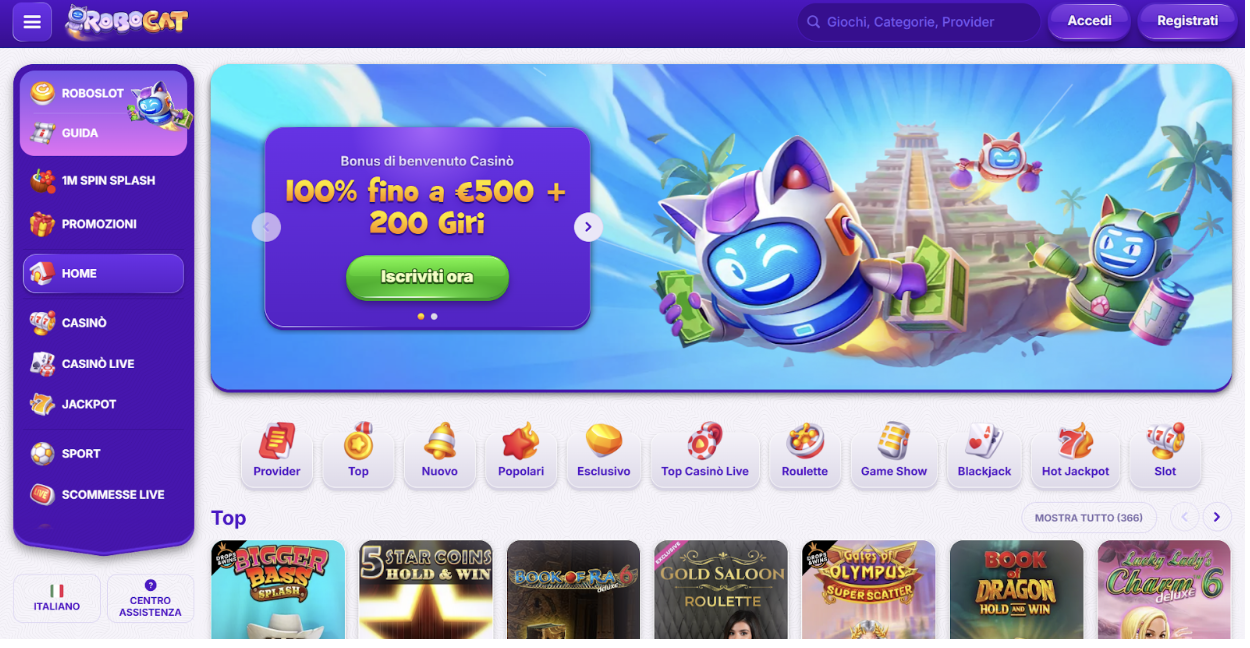 Robocat è un casinò tematico hi-tech con ambientazione futuristica e slot innovative. Si rivolge a giocatori esperti, con offerte fedeltà a più livelli, jackpot giornalieri e un sistema di missioni per sbloccare premi esclusivi. Un’esperienza di gioco coinvolgente e progressiva.