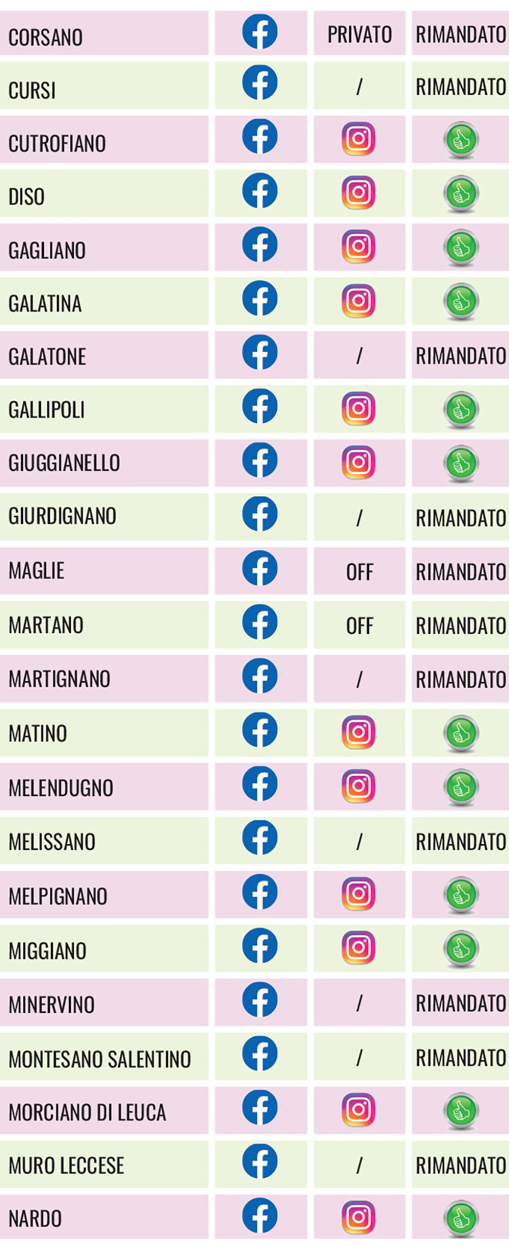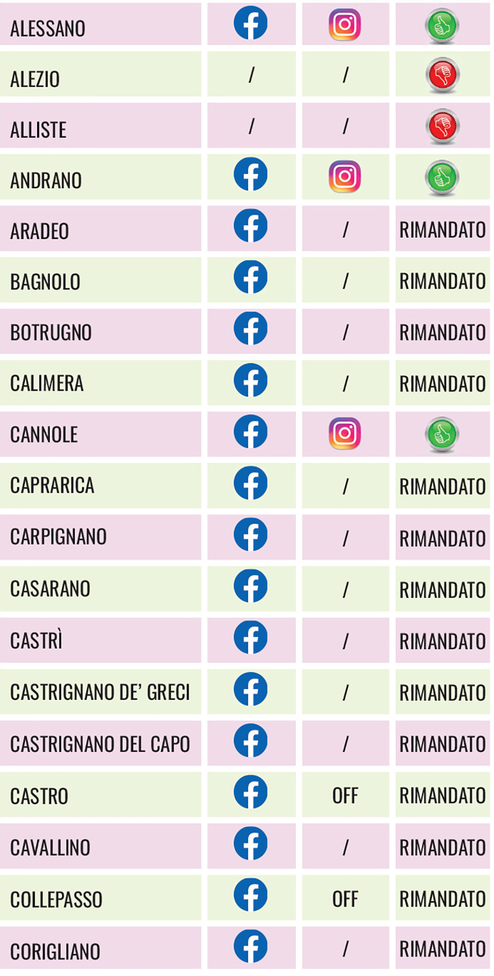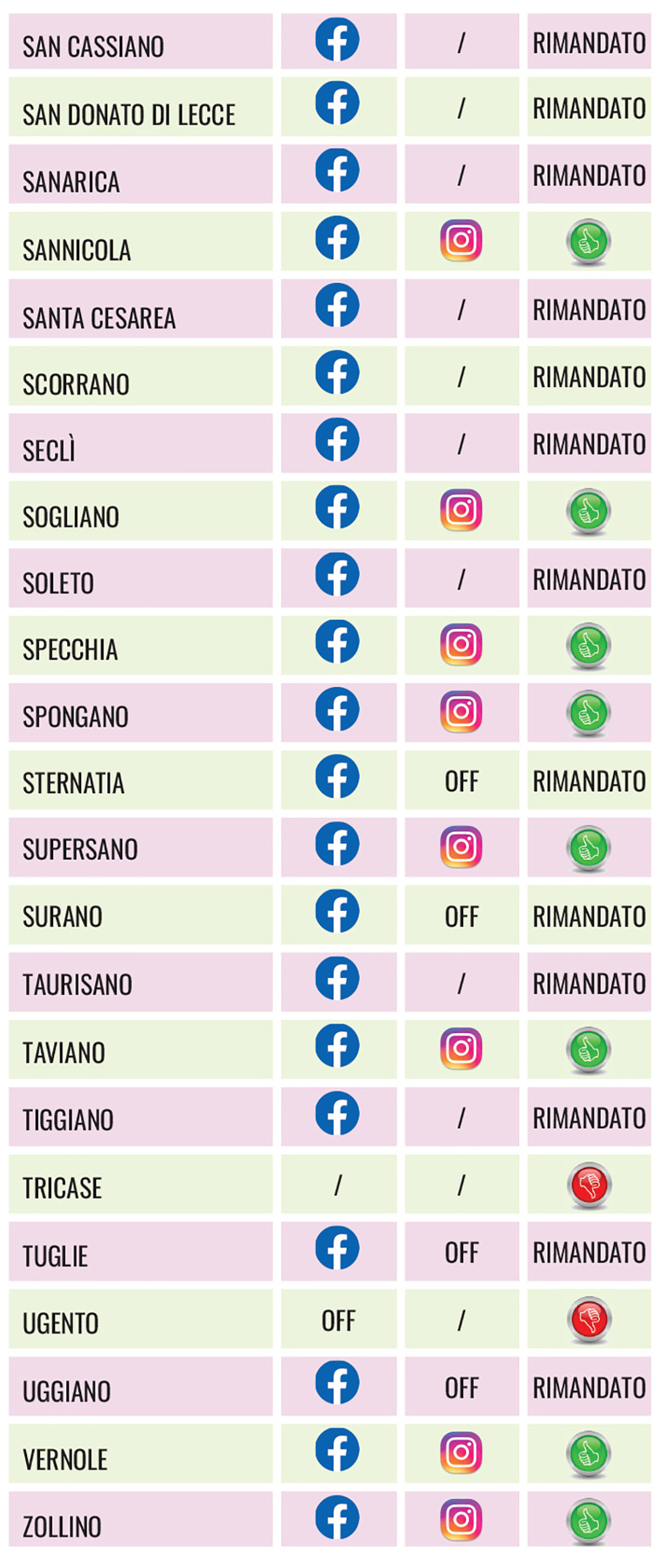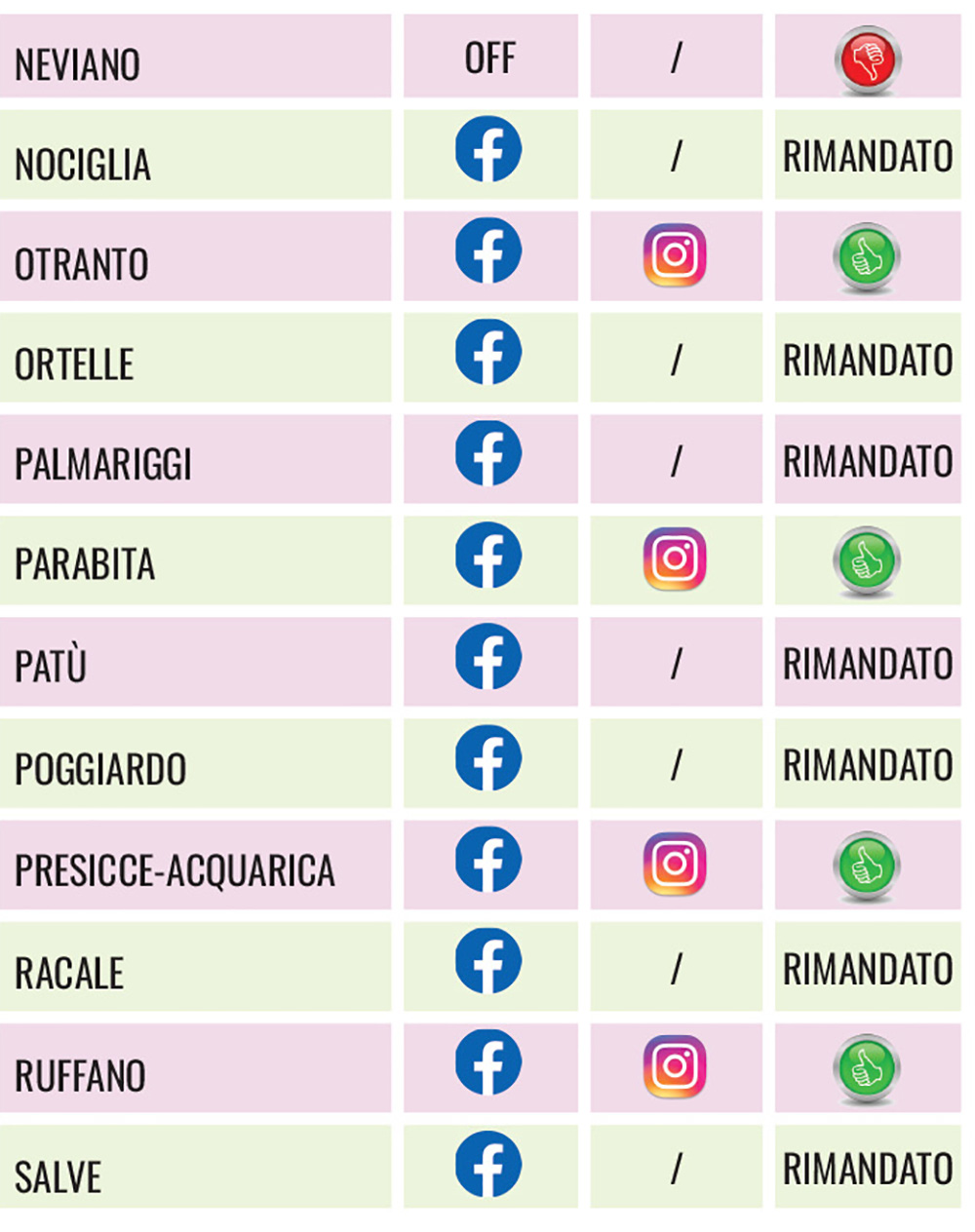 (NdA, per mero errore di trascrizione, San Cassiano in tabella compare tra i rimandati. In realtà, invece, è attivo su Instagram oltre che su FB)