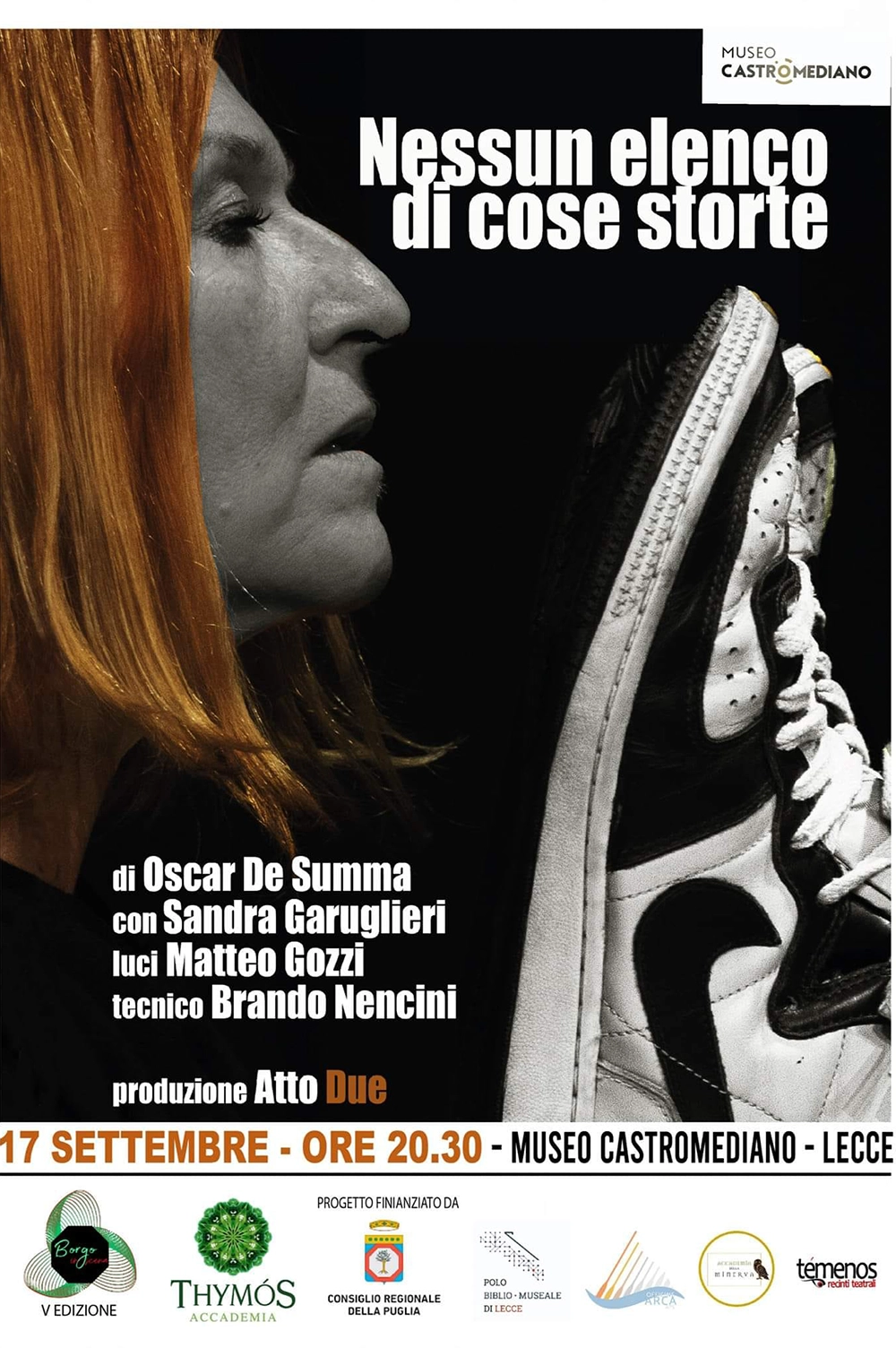 L’evento è inserito all’interno della rassegna musico-teatrale “Borgo in scena”, giunta alla sua quinta edizione e curata da Accademia Thymòs, sotto la direzione artistica di Vincenza De Rinaldis, in collaborazione con Accademia della Minerva, Polo Biblio museale di Lecce, Témenos Recinti Teatrali e Officine Arca APS, con il contributo finanziario del Consiglio Regionale della Puglia.