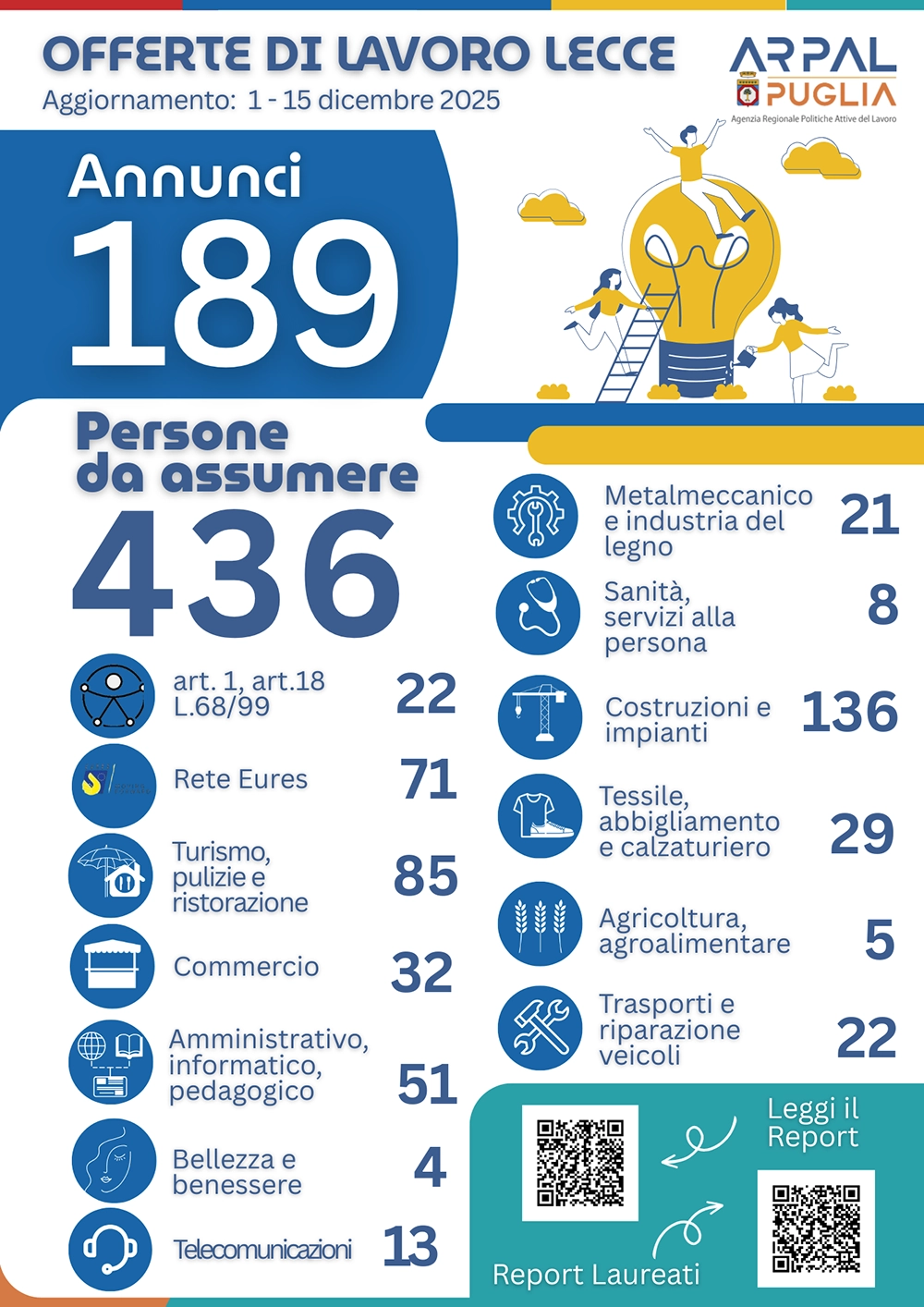 Il 43° Report di ARPAL Puglia, in via eccezionale bisettimanale dall’1 al 15 dicembre, propone complessivamente 189 offerte lavorative per un totale di 436 posizioni aperte.