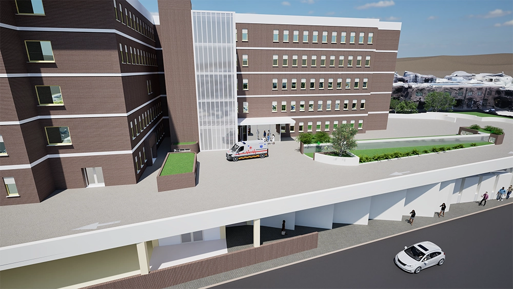 «Non offrirà nuovi posti letto», chiarisce l’ing. Antonio Coppola, «sarà funzionale ad un adeguamento di tutti i servizi dell’ospedale. Il piano più in basso, al livello dell’ingresso carraio, è destinato a quelle attività che hanno rapporti diretti con l’esterno: carico e scarico merci, lavanderia, uffici tecnici, economato per il personale, zona operai, ecc. In questo modo non ci saranno interferenze con la movimentazione sanitaria. Al piano immediatamente superiore verrà il Centro unico di prenotazione (CUP). Non ci saranno più postazioni sparse, sarà tutto concentrato in questo piano con ingresso, fornito di rampa per disabili, da via Giovanni XXIII. Sarà un grosso CUP con ampia zona di ristoro e attesa. Sullo stesso piano anche parafarmacia e gli ambulatori collegati con il primo accesso per prericovero, prelievo, ecc. Sullo stesso livello dell’attuale piano terra avranno sede il laboratorio di analisi e l’ampliato servizio immunotrasfusionale. Su quello che corrisponde all’attuale primo piano, per tutta la dimensione della piastra, altri ambulatori ed una parte destinata ad attività dirigenziali: direzione amministrativa, direzione sanitaria, eccetera. Il piano più su è destinato agli ambulatori che richiedono più spazio».