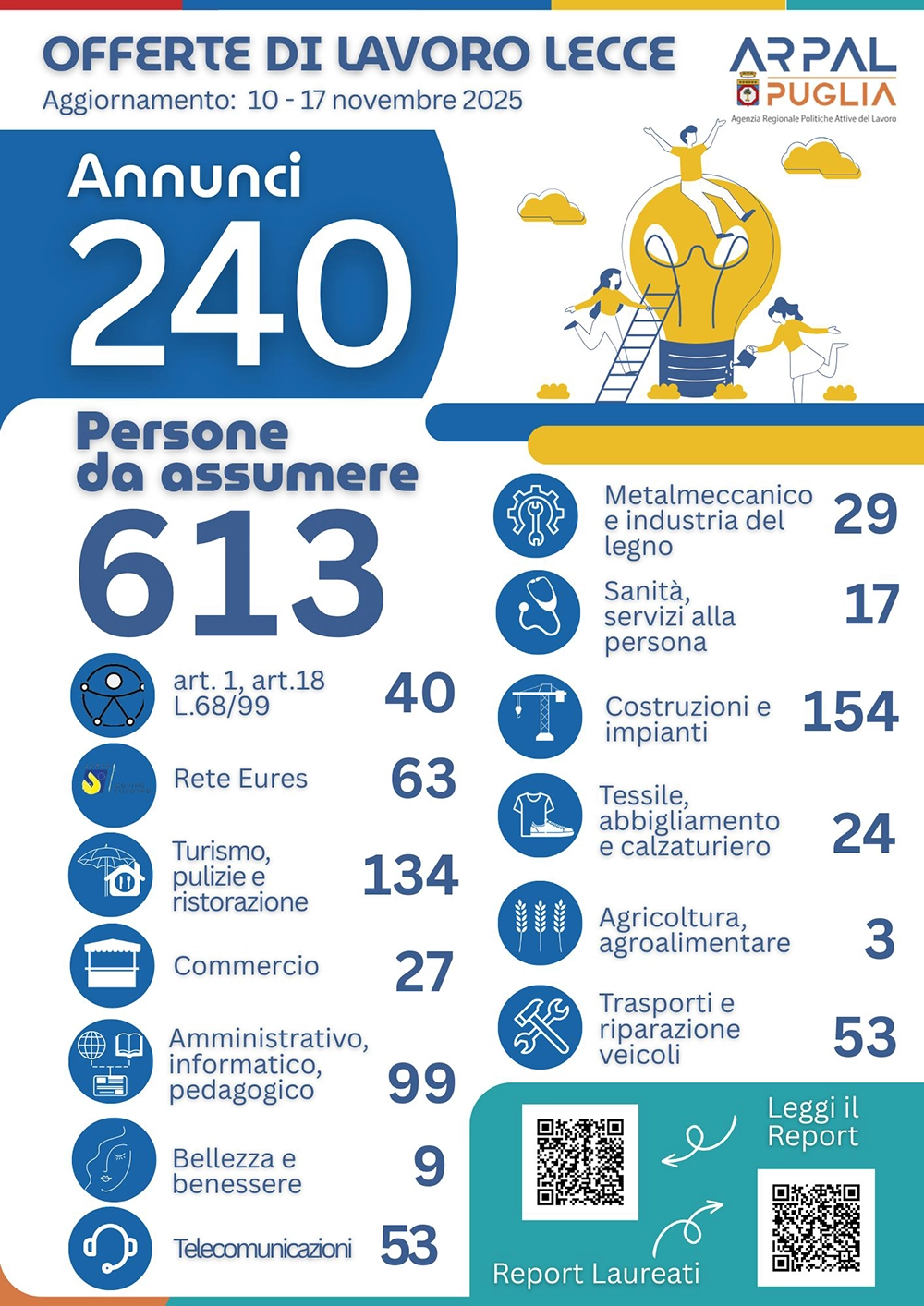 Questa settimana il Report di Arpal Puglia propone complessivamente 240 offerte lavorative per un totale di 613 posizioni aperte.
