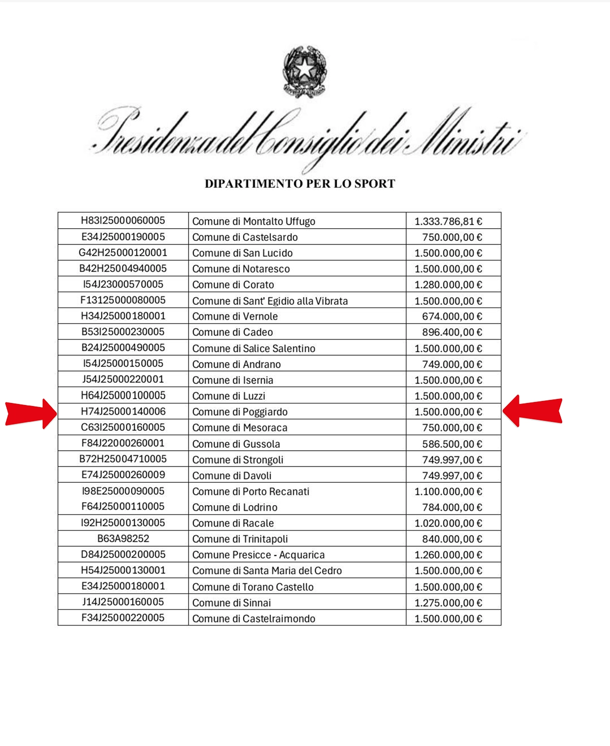 «Infine», conclude il sindaco, «spulciare l’elenco dei Comuni ammessi. Prima pagina: assenti! Seconda pagina: presenti e finanziati, con 1.500.000 euro di risorse pubbliche di Sport e Periferie. Un risultato immaginato, disegnato, sognato, desiderato e, infine, ottenuto!».