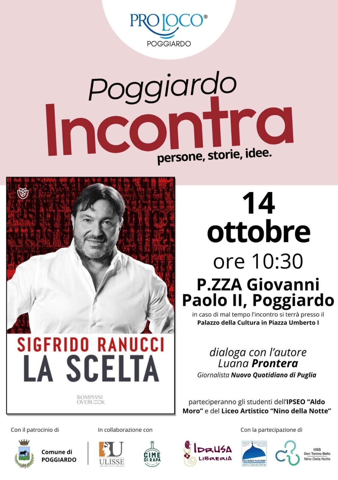 Dalle 10,30, in piazza Giovanni Paolo II, nell’ambito della rassegna PoggiardoIncontra, Ranucci presenterà il suo ultimo libro “La scelta”, confrontandosi con gli studenti e con la giornalista Luana Prontera (Quotidiano).