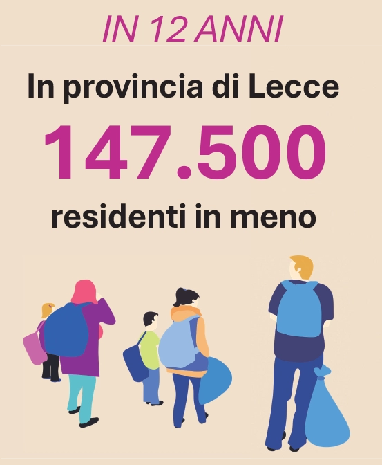 Nel 2012, la provincia contava 912mila residenti: tredici anni dopo se ne contano 764.491. Il nostro Salento ha, dunque, registrato una perdita di circa 147.500 abitanti, segnando, in 13 anni, un preoccupante calo del 16,17%, oltre 16 persone in meno ogni 100!