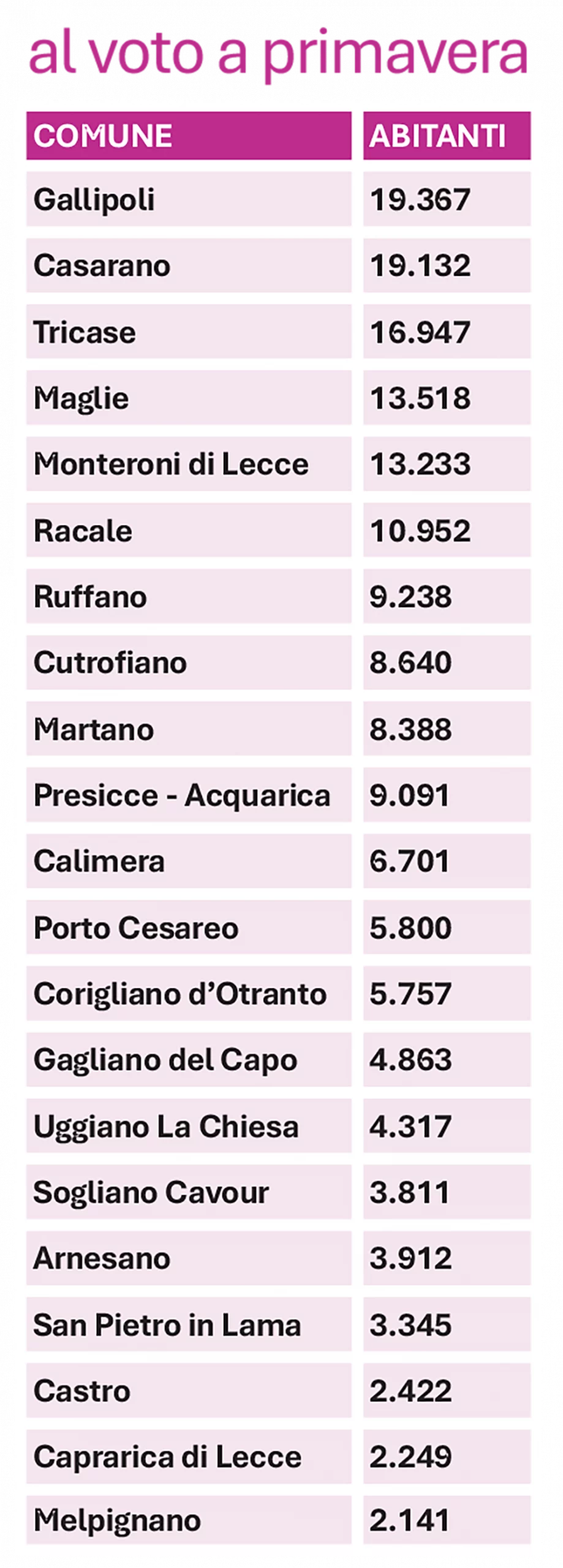 Ci apprestiamo a una nuova stagione di elezioni con chiamate alle urne prima per il referendum di fine marzo e poi per le amministrative di primavera che, in provincia di Lecce, riguarderanno 21 Comuni: Casarano, Gallipoli, Tricase (con popolazione superiore a 15mila abitanti ed eventuale ballottaggio), Maglie, Martano, Melpignano, Caprarica di Lecce, Calimera, Corigliano d’Otranto, Cutrofiano, Sogliano Cavour, Gagliano del Capo, Ruffano, Castro, Presicce-Acquarica, Racale, Porto Cesareo, Uggiano La Chiesa, Arnesano, Monteroni di Lecce e San Pietro in Lama.