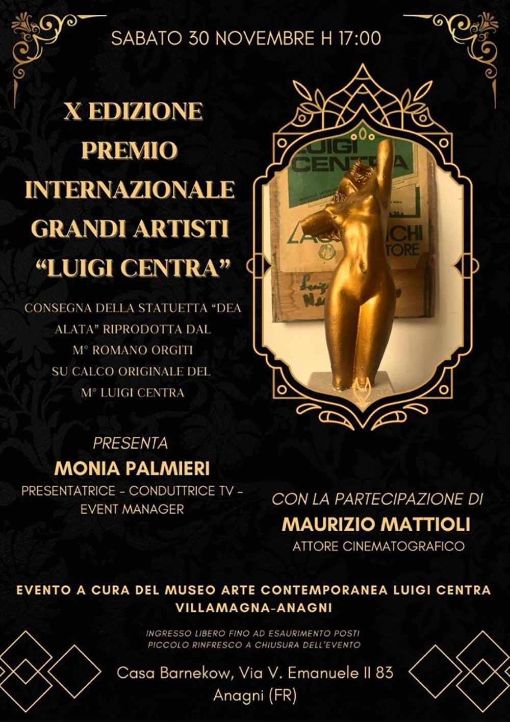 La cerimonia di premiazione la decima edizione del Premio Internazionale Grandi Artisti “Luigi Centra” sarà condotta dalla presentatrice, conduttrice Tv ed Event Manager di Maglie, Monia Palmieri, che nel 2022, ad Isola Del Liri (Fr), ha ricevuto il prestigioso premio per la sua attività artistica e fu premiata dallo stesso Maestro Luigi Centra che le consegnò la bellissima statuina della Dea Alata da lui stesso realizzata.