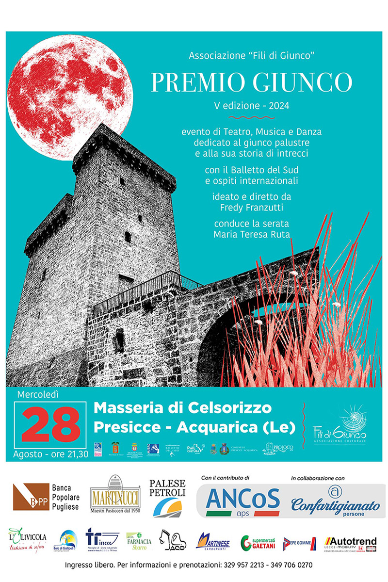 Mercoledì 28 agosto, dalle 21,30, nella Masseria Fortificata Celsorizzo (località Acquarica) l’evento di danza, musica e teatro dedicato al giunco palustre e al suo intreccio. Conduce Maria Teresa Ruta. Con Balletto del Sud, Carolina Bubbico, Andrea Sirianni, Carlos Sanchez Segura, i Fratelli Gargarelli