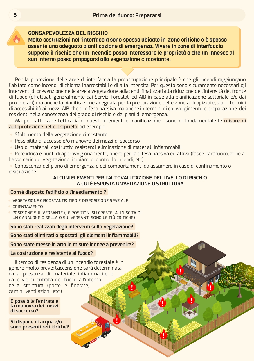 Ma le domande e i dubbi dinanzi a questa questione possono trovare impreparate le persone che sfortunatamente si trovino ad affrontare il pericolo, ad esempio: “Qual’è il rischio a cui è esposta la proprietà e come la si puó rendere piú resistente al fuoco?”; “Come comportarsi nel caso in cui un incendio si avvicini alla propria abitazione o area antropizzata?”; “Come predisporre uno spazio difensivo nella propria abitazione per ridurre la vulnerabilità e permettere che le squadre di soccorso e spegnimento possano intervenire in sicurezza?”; “Quali sono i comportamenti da adottare durante e dopo il passaggio del fuoco?”.