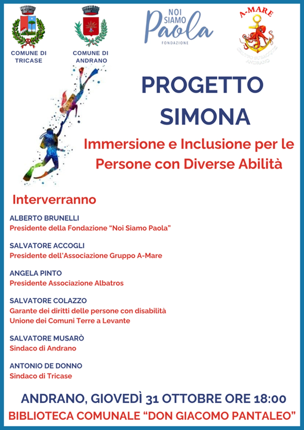 Il comune di Andrano presenta il convegno “Progetto Simona: Immersione e Inclusione per le Persone con Diverse Abilità”, un’iniziativa nata dalla collaborazione con la Fondazione “Noi Siamo Paola” e l’Associazione Gruppo A-Mare.