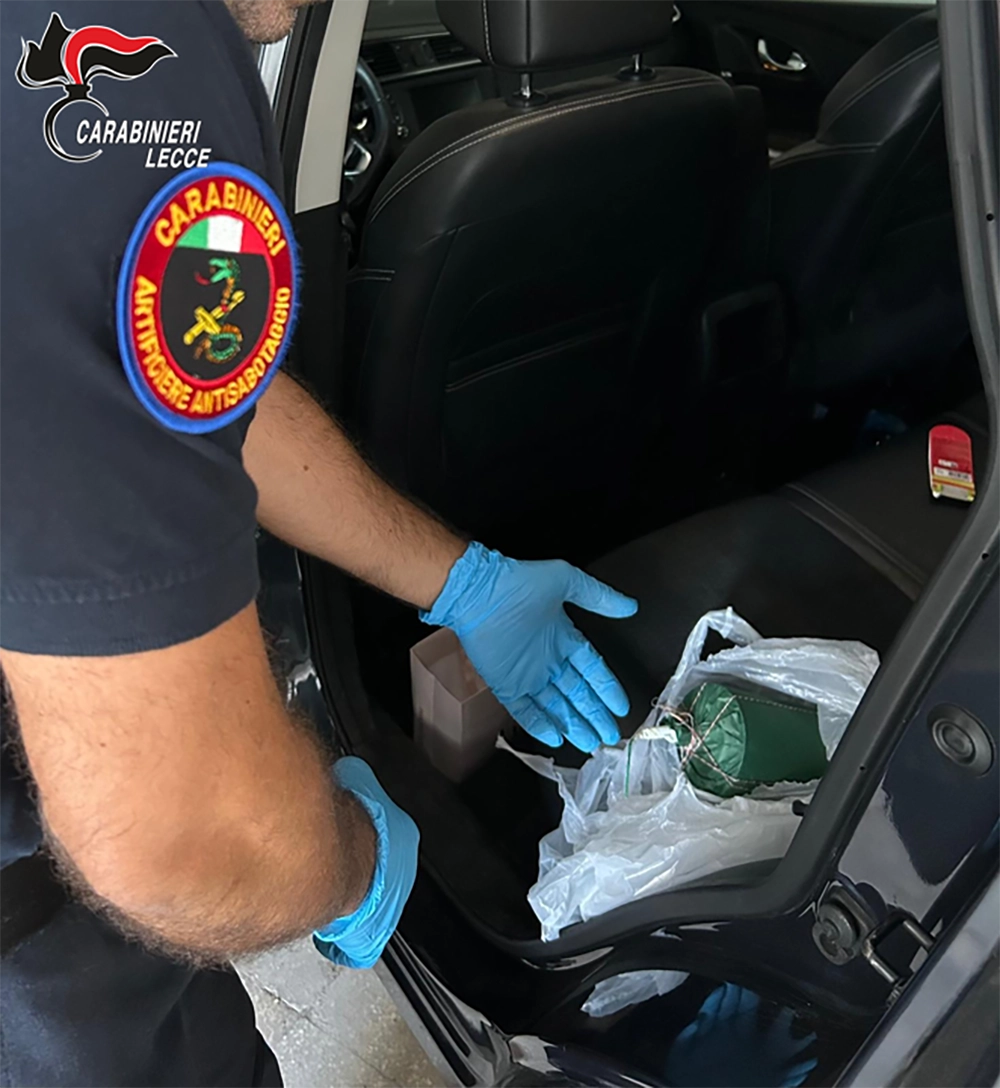 All’interno dell’auto, i carabinieri hanno rinvenuto un manufatto esplosivo artigianale di oltre un chilogrammo, immediatamente sottoposto a intervento dagli Artificieri del Nucleo Investigativo del Comando Provinciale di Lecce, che hanno provveduto a disattivarlo, campionarlo e distruggerlo in totale sicurezza.