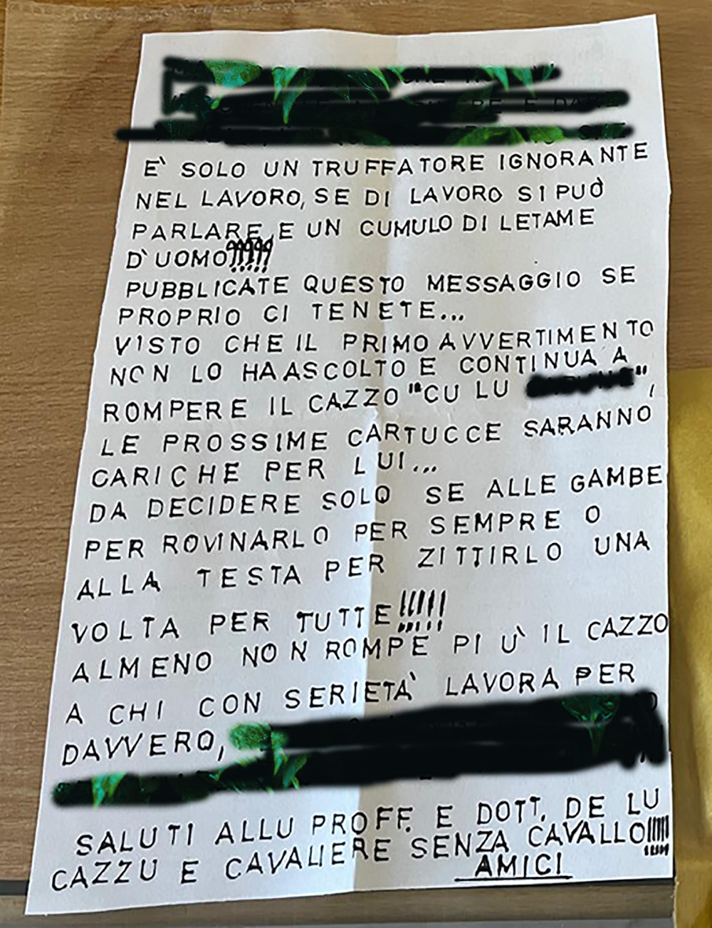 Quella poco velata è indirizzata ad un imprenditore della zona, al quale gli improperi, i fulmini e le maledizioni vengono indirizzati, vergati in maiuscolo, per dare maggiore enfasi alla minaccia: «È solo un truffatore ignorante nel lavoro, se di lavoro si può parlare, è un cumulo di letame d’uomo».