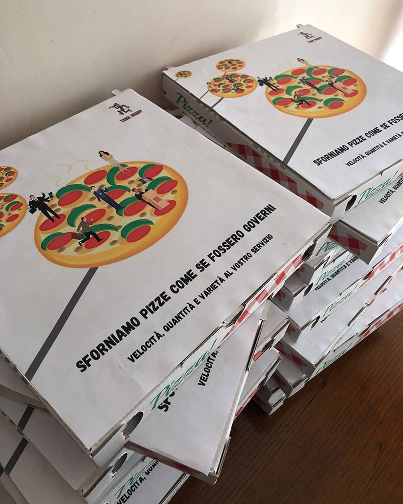 Allora sul cartone venne rappresentata una pizza con degli omini con la scritta “Sforniamo pizze come se fossero governi: velocità, quantità e varietà al vostro servizio”.