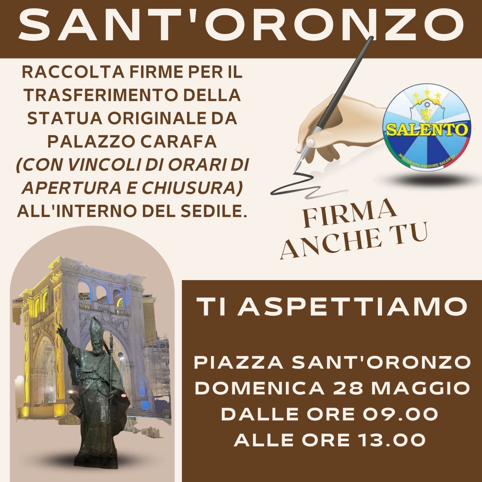 Raccolta firme del MRS: “Spostiamo la statua di Sant’Oronzo”