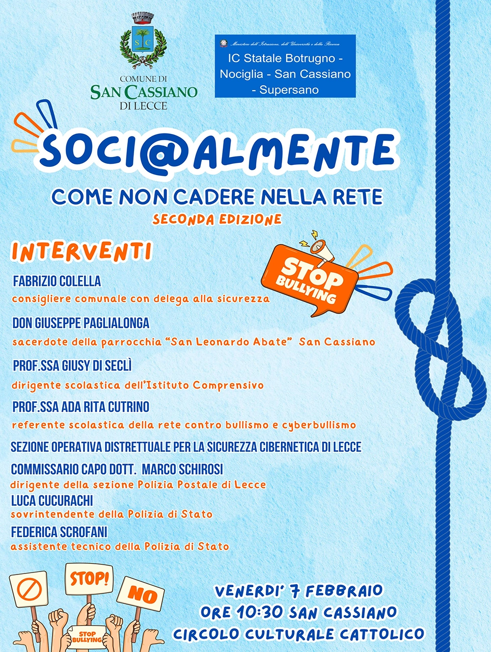 L’incontro con le classi secondarie (prime e seconde medie) dei quattro plessi scolastici di San Cassiano, Botrugno, Nociglia e Supersano, dal nome “Soci@lMente – Come non cadere nella rete”, seguirà il seguente programma:
