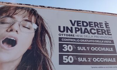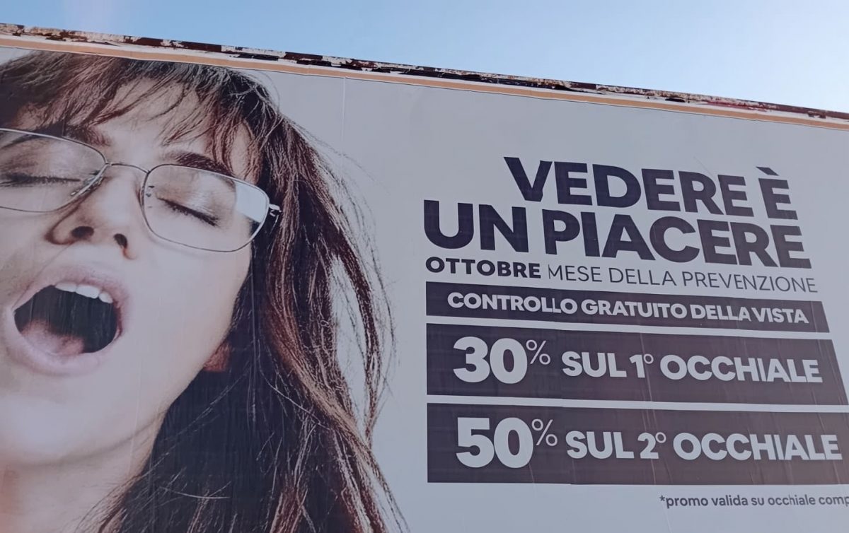 Tale manifesto pubblicitario dovrebbe riguardare la vista con conseguente controllo e acquisto di occhiali ma il claim, “vedere è un piacere”, viene associato ad un’immagine di una donna in evidente stato di godimento sessuale quindi l’associazione con il vedere e la vista in generale viene messo in secondo piano.