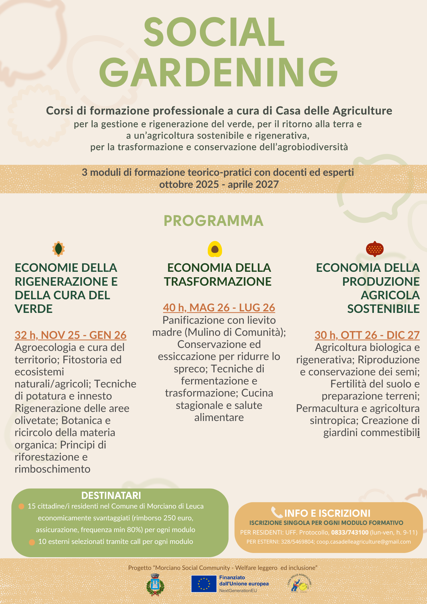 L’iniziativa rientra nel progetto “Morciano Social Community – Welfare leggero ed inclusione”, finanziato dal Piano Nazionale di Ripresa e Resilienza (PNRR) – Missione “Inclusione e Coesione”. Nasce per formare competenze professionali legate all’agroecologia, alla cura del paesaggio e alla filiera corta, promuovendo una visione integrata tra formazione, inclusione e rigenerazione territoriale.