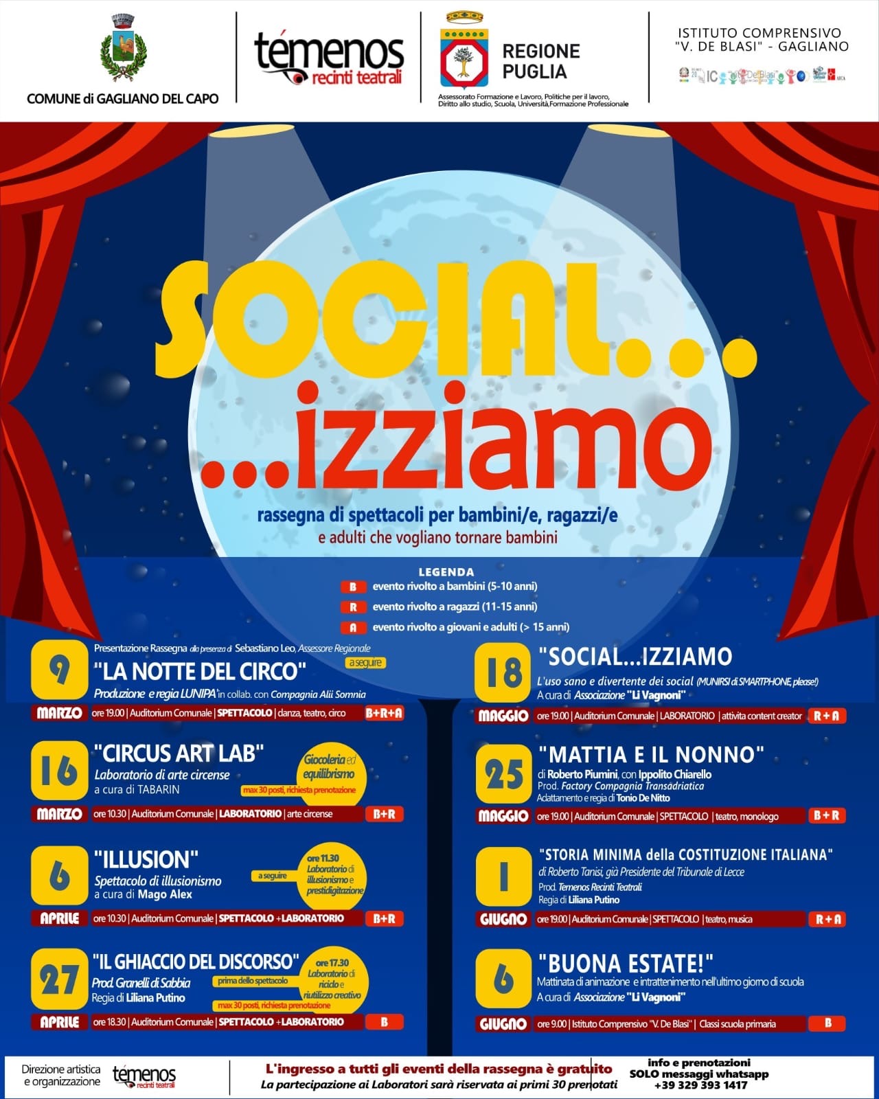 Prenderà l’avvio domani, domenica 9 marzo, a Gagliano del Capo la Rassegna ” *Social…izziamo* “, promossa dal Comune di Gagliano del Capo e finanziata dall’Assessorato Regionale alla Formazione e Lavoro, Politiche per il Lavoro, Diritto allo Studio, Scuola, Università e Formazione professionale.