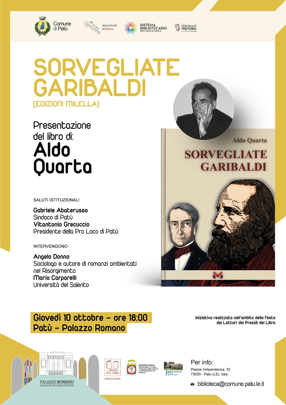 Si parlerà di tutto questo in due incontri pubblici in programma a Lecce domani, mercoledì 9 ottobre (libreria Palmieri, via Trinchese 62, ore 18,30) e a Patù il giorno seguente, giovedì 10 ottobre (palazzo Romano, piazza Indipendenza, ore 18) per presentare il libro di Aldo Quarta, “Sorvegliate Garibaldi” (Edizioni Milella).