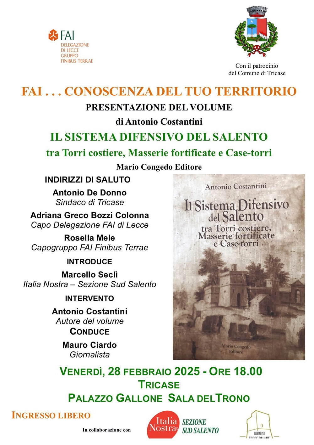 FAI… conoscenza del tuo territorio: l’incontro con l’autore, a ingresso libero, si terrà venerdì 28 febbraio, ore 18, presso la Sala del Trono di Palazzo Gallone, a Tricase.