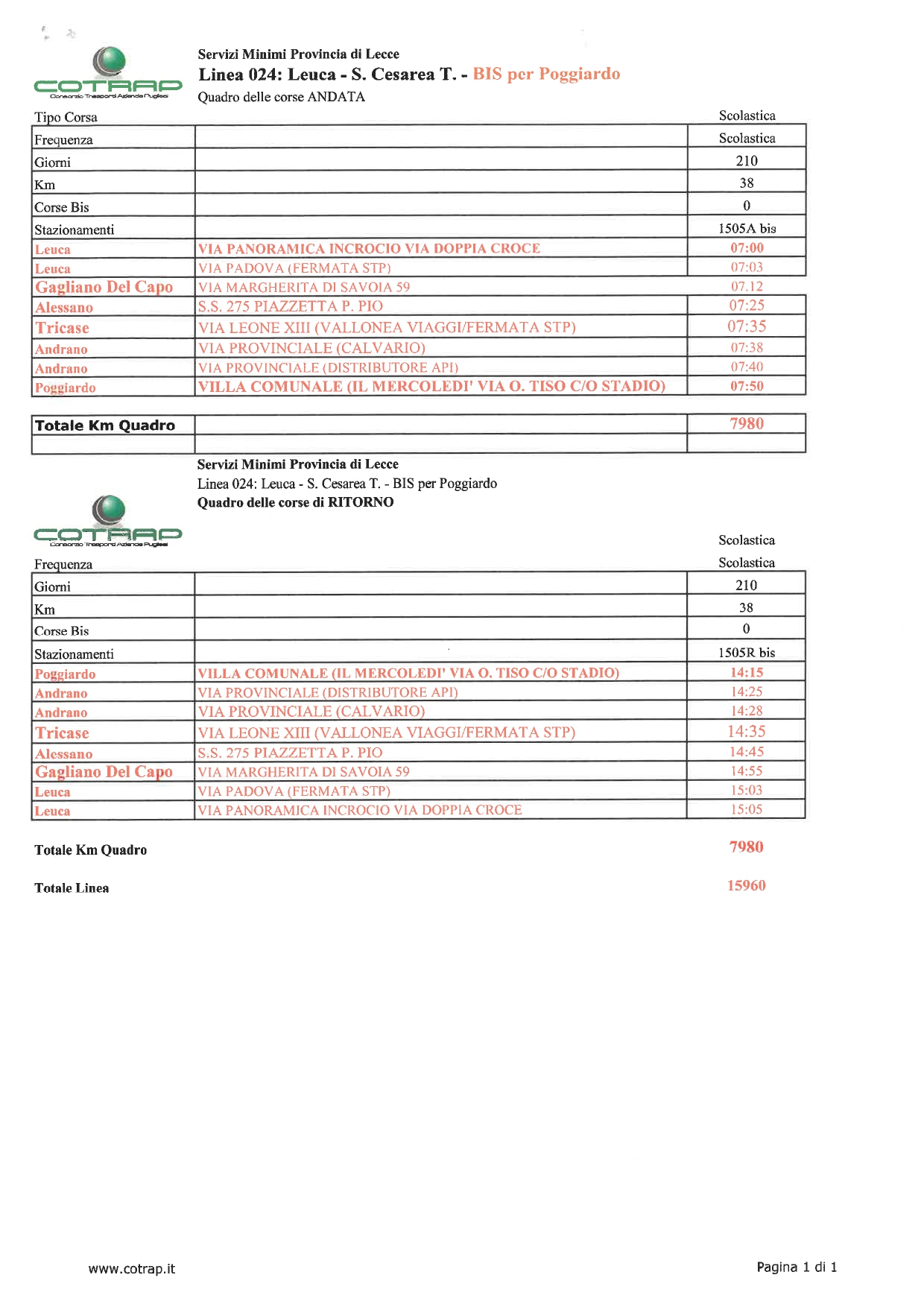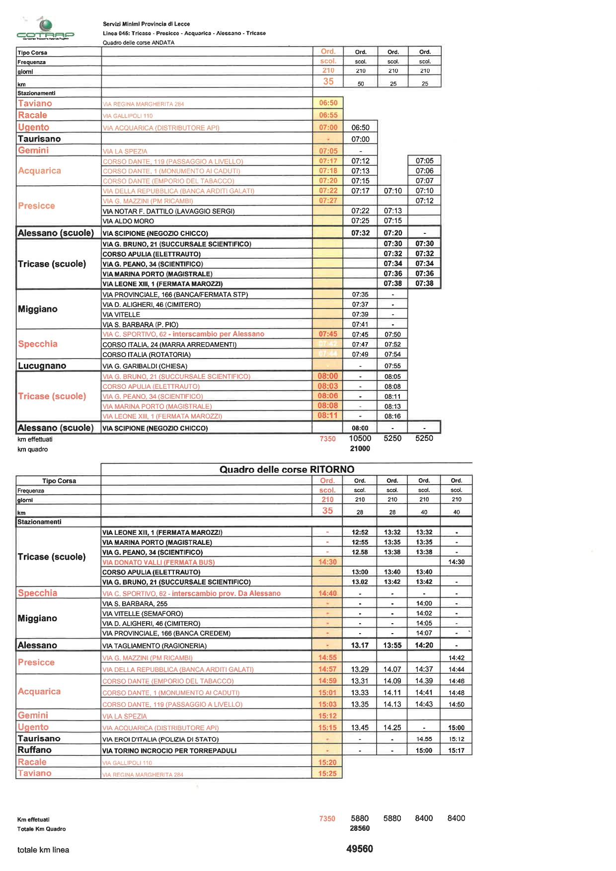 – sono state corrette alcune fermate sulla corsa in bis della linea 045 (evidenziata in arancio con caratteri rossi); si prenda nota inoltre che pur non essendo menzionato lo stazionamento di Montesano Salentino, gli utenti della tratta Montesano Salentino-Tricase continueranno ad usufruire, come già fanno, della corsa Castiglione-Montesano-Tricase dalla linea 031. Quest’ultima, grazie all’attivazione del bis, risulta infatti meno affollata: