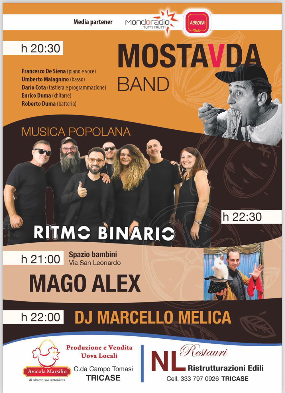A seguire l’immancabile pizzica salentina con l’esibizione dei Ritmo Binario, gruppo composto da 8 ragazzi legati dalla passione per la musica e che loro amano definire “popolana” perchè si fonda sull’idea della contaminazione di generi musicali accostando nuovi ritmi agli elementi tradizionali della pizzica (reggae, folk etc…), con l’obiettivo di proporre agli ospiti uno spettacolo sui generis, la cui particolarità è il contatto diretto con il pubblico.