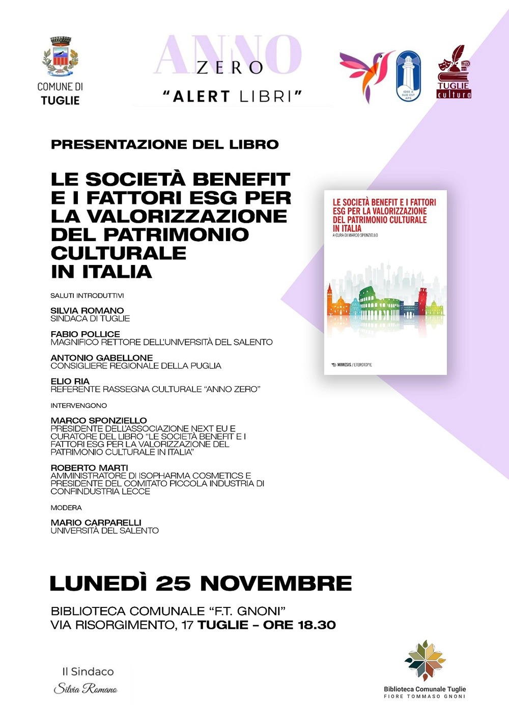 Nell’ambito della rassegna culturale “Anno Zero”, lunedì 25 novembre, alle ore 18,30, presso la Biblioteca Comunale “F. T. Gnoni” di Tuglie, sarà presentato il libro “Le Società Benefit e i fattori ESG per la valorizzazione del patrimonio culturale in Italia” (Mimesis),