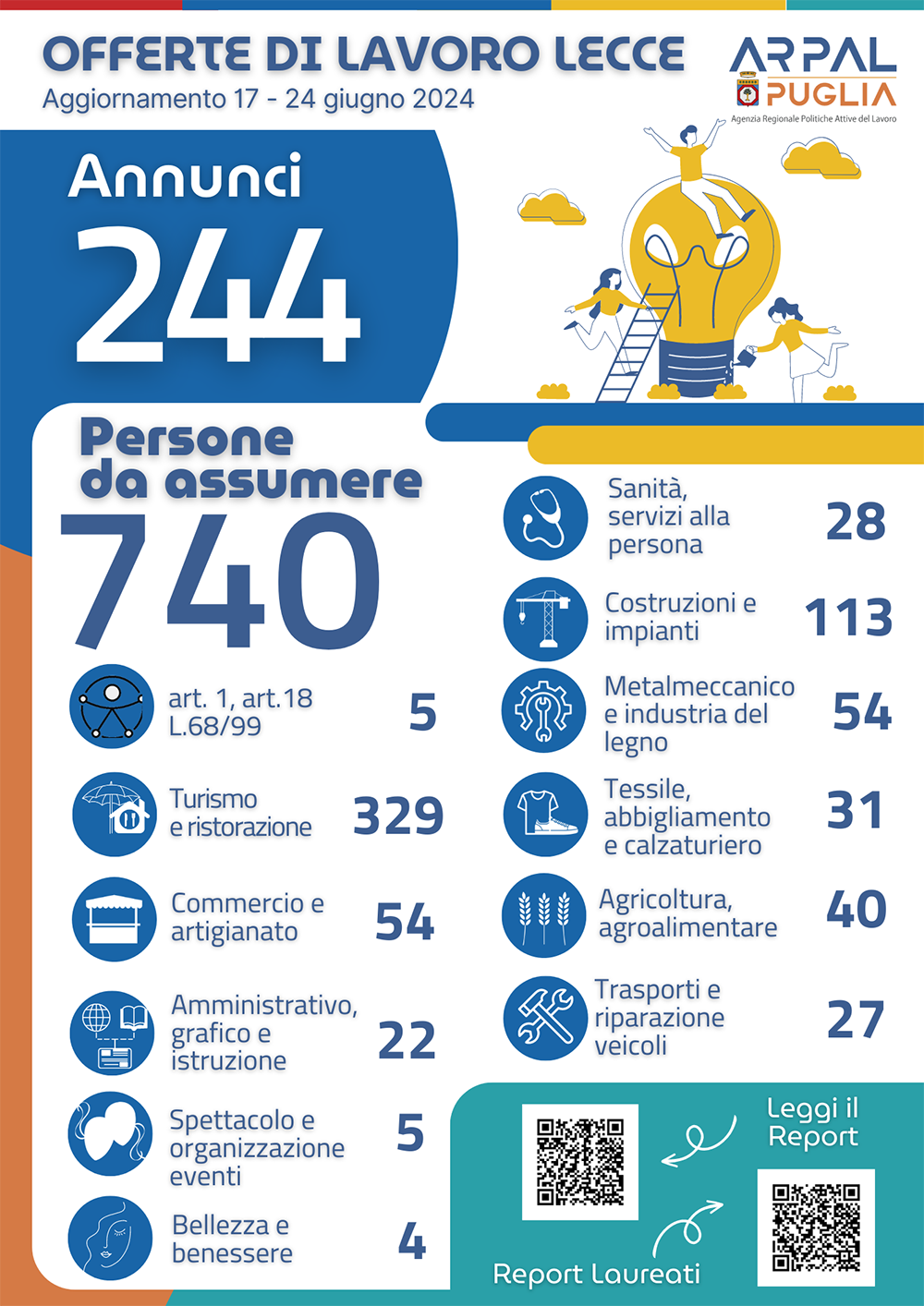 Nel complesso, nel 21° Report settimanale dell’Ambito di Lecce si contano 244 annunci per un totale di 740 posizioni lavorative.