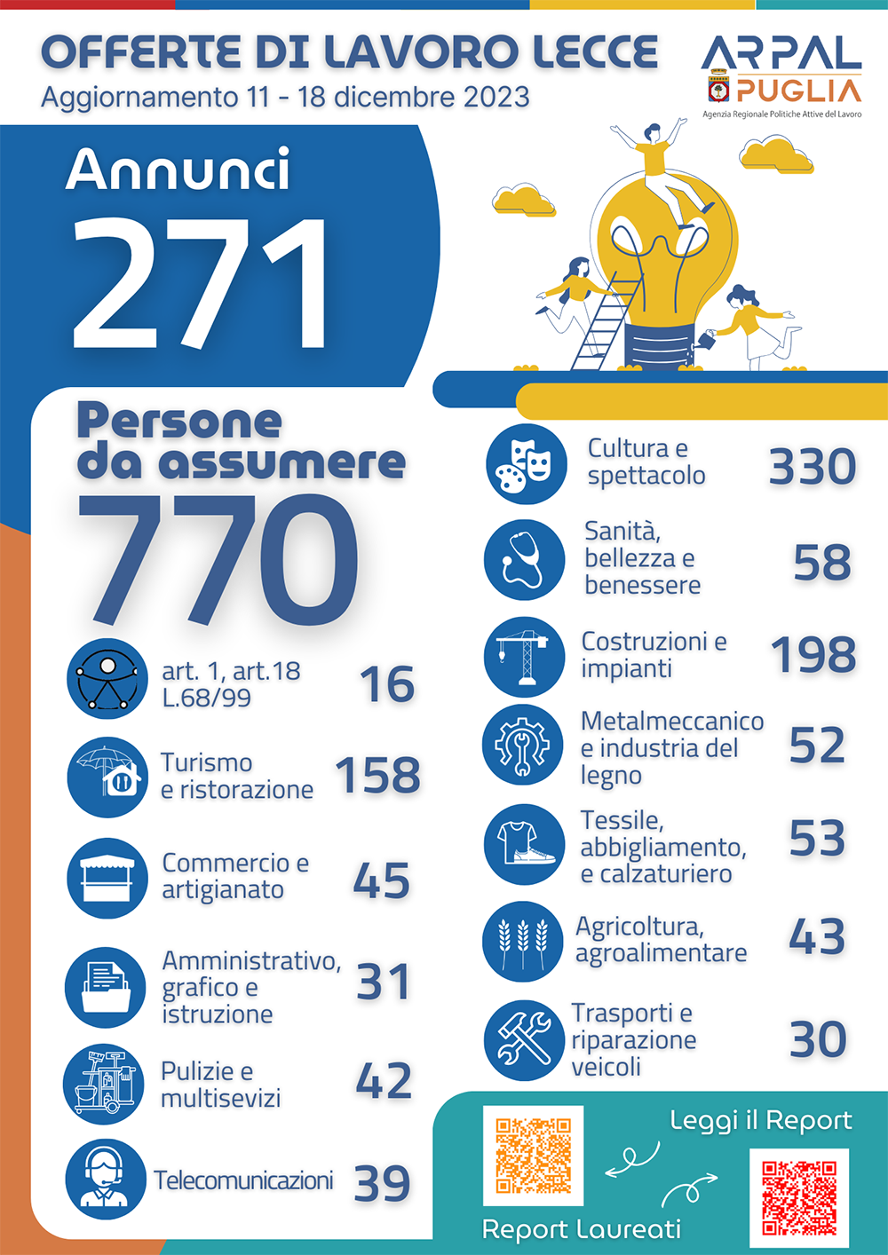Il 49° Report settimanale delle offerte di lavoro di Arpal conta di 271 annunci, cui si aggiungono 119 offerte legate al Decreto Flussi, per un totale di 770 posizioni aperte in tutto il Salento