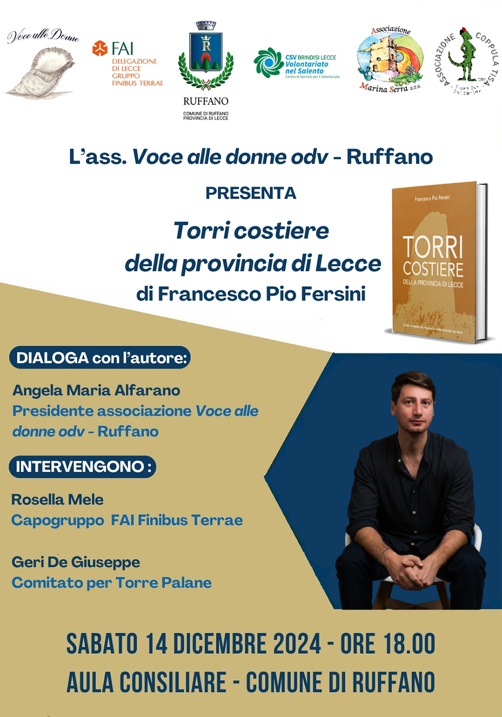Sabato 14 dicembre alle ore 18, presso l’aula consiliare di Ruffano, Voce alle donne odv presenterà il Libro “Torri costiere della provincia di Lecce” di Francesco Pio Fersini