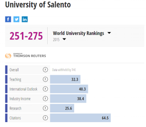 Casca a pennello allora la classifica mondiale delle Università “Times Higher Education World University Rankings 2014-2015” stilata da Thomson Reuters che inserisce l’Università del Salento tra le prime 300 al mondo, precisamente al 263esimo posto. Sorprendente il risultato nazionale: l’ateneo salentino è il quinto in Italia ed il primo nel Mezzogiorno.