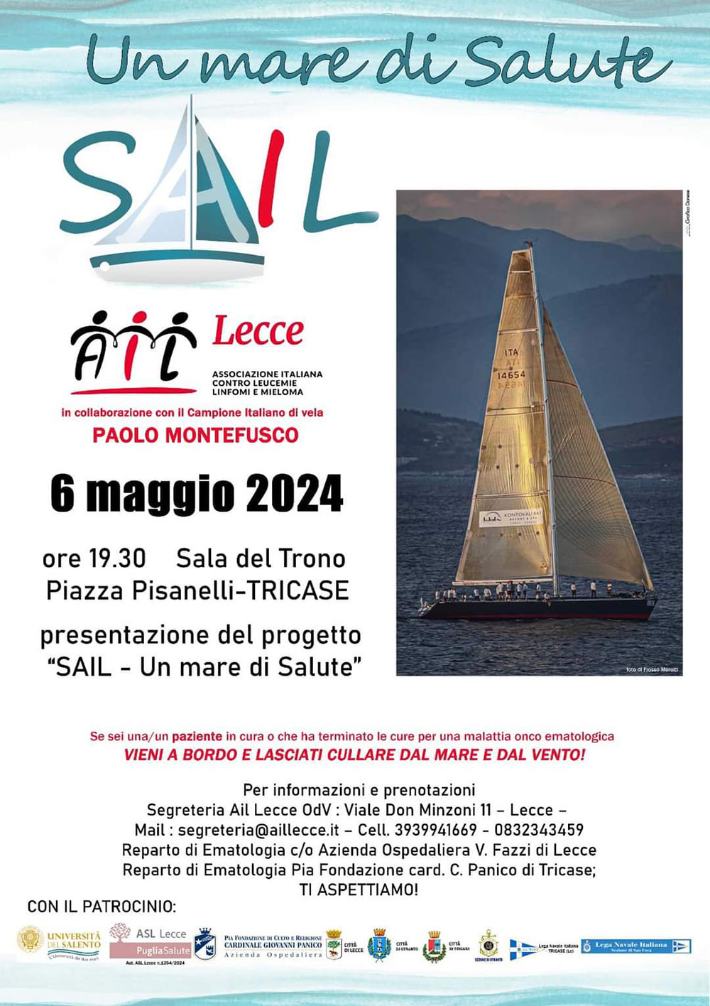L’AIL, associazione italiana contro leucemia, linfomi e mieloma, ed il campione mondiale di vela Paolo Montefusco presentano a Tricase il progetto SAIL.