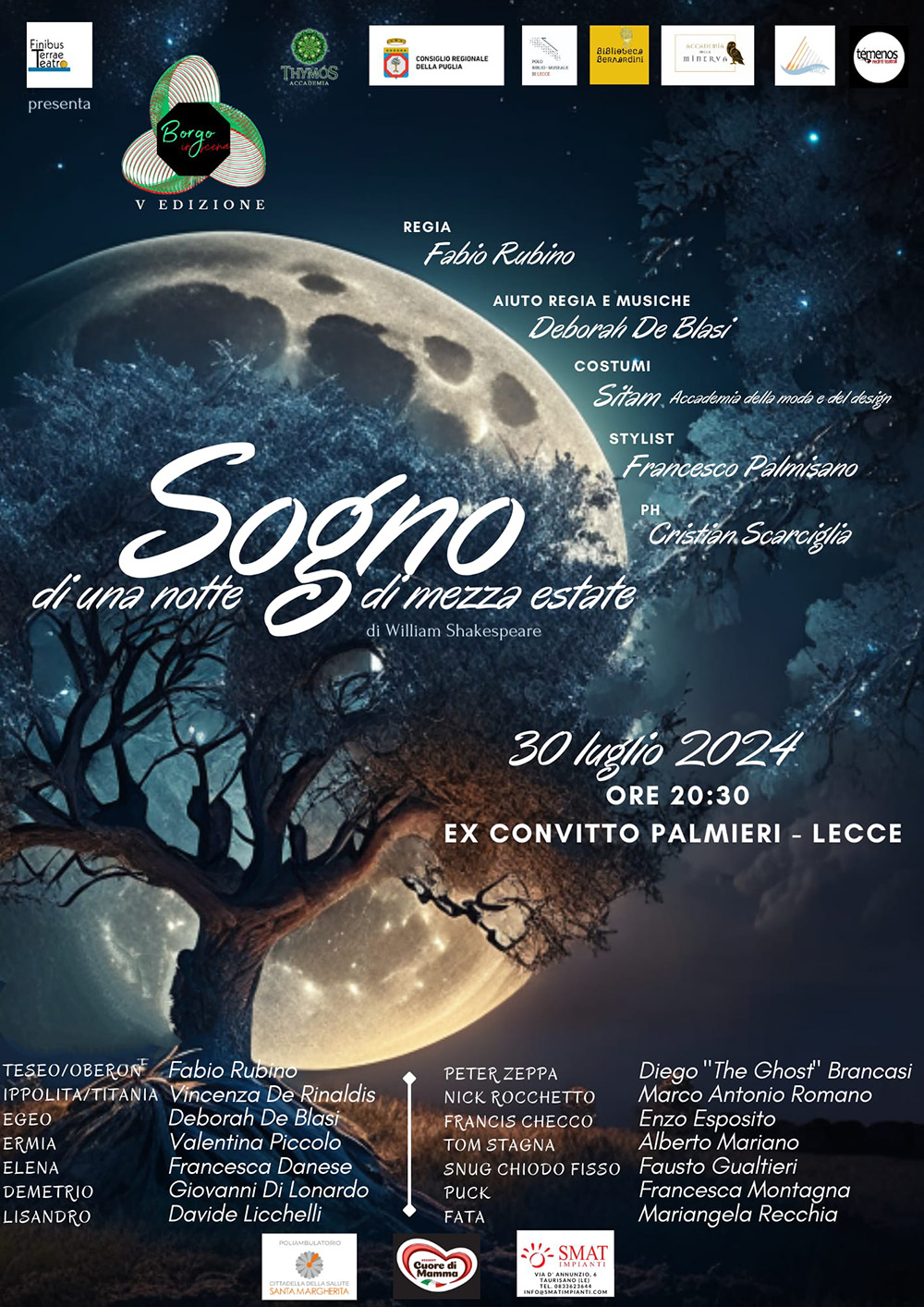 Martedì 30 luglio 2024, alle ore 20,30, presso l’Ex-Convitto Palmieri a Lecce, la compagnia Finibus Terrae Teatro porterà in scena “Sogno di una notte di mezza estate” di W. Shakespeare.