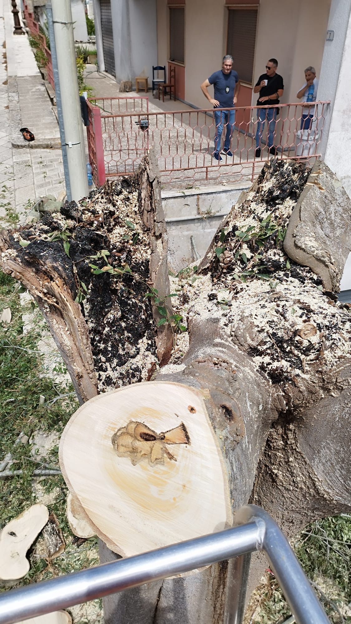 L’albero, a malincuore, è stato tagliato mercoledì 24 luglio. Il taglio ha mostrato, inequivocabilmente, la gravissima condizione in cui versava: Il BAGOLARO ERA GRAVEMENTE MALATO E L’INTERNO DEL SUO TRONCO E DI TUTTI I GROSSI RAMI ERA MARCIO E VUOTO O SPUGNOSO. Probabilmente, come riferito dagli esperti, le capitozzature (deleterie per i bagolari) fatte anni fa, hanno causato infezioni tali da fare ammalare gravemente l’albero.