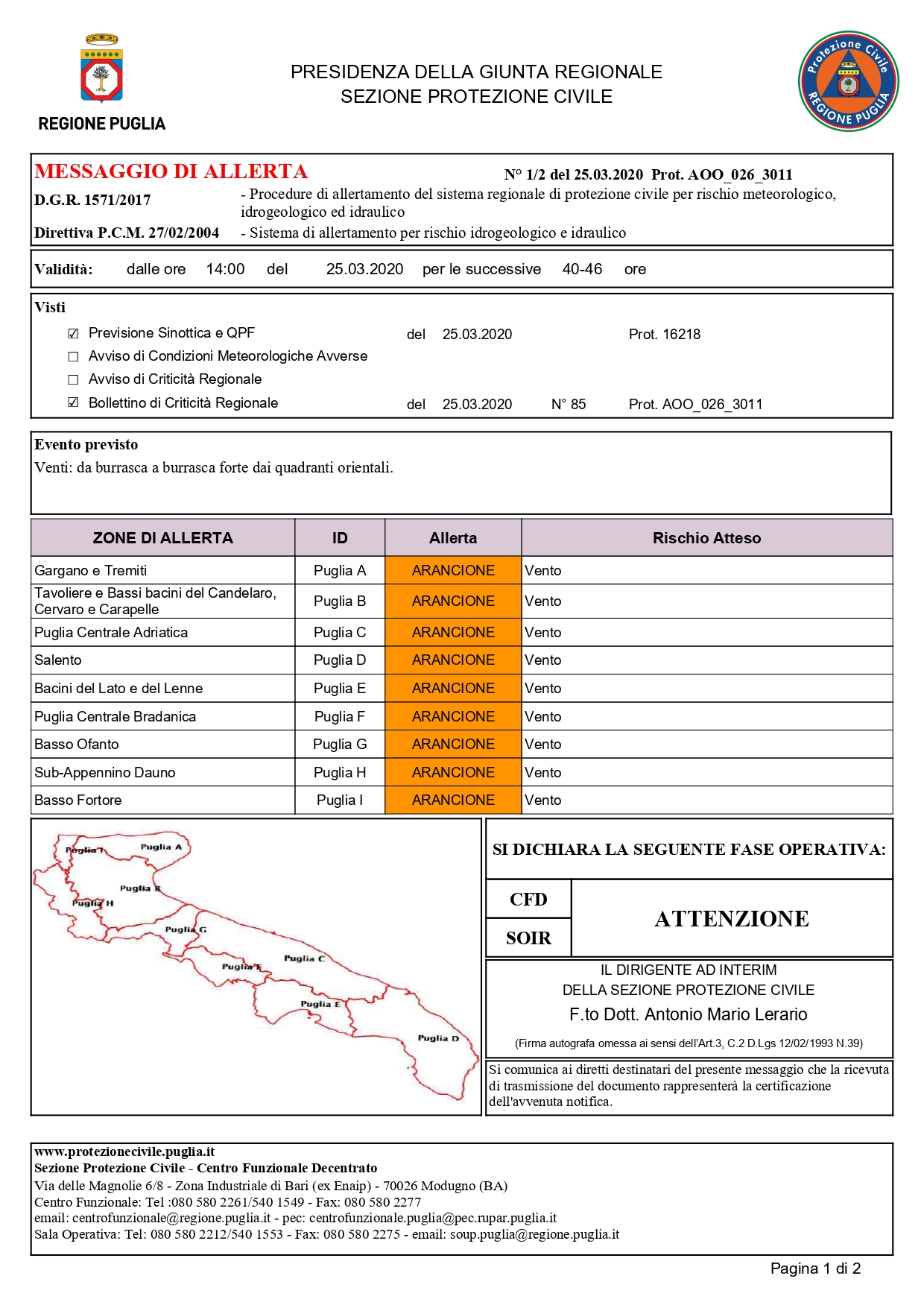 La Protezione Civile: attesi su tutta la Puglia venti di burrasca e forti precipitazioni