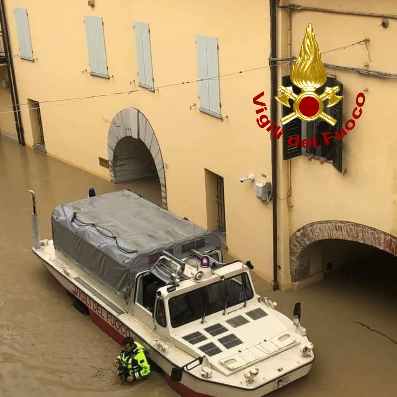 Attualmente, in Emilia Romagna, sono impegnati 750 vigili del fuoco, quasi 300 nella sola provincia di Forlì Cesena, 400 le unità giunte come rinforzo dalle altre regioni: 250 sono soccorritori acquatici, 65 esperti nelle operazioni di prosciugamento con pompe e idrovore, 15 sommozzatori. Dei 250 mezzi impiegati attualmente nei luoghi colpiti dal maltempo, 25 sono piccoli natanti, 4 gli anfibi, 5 elicotteri e 10 droni.