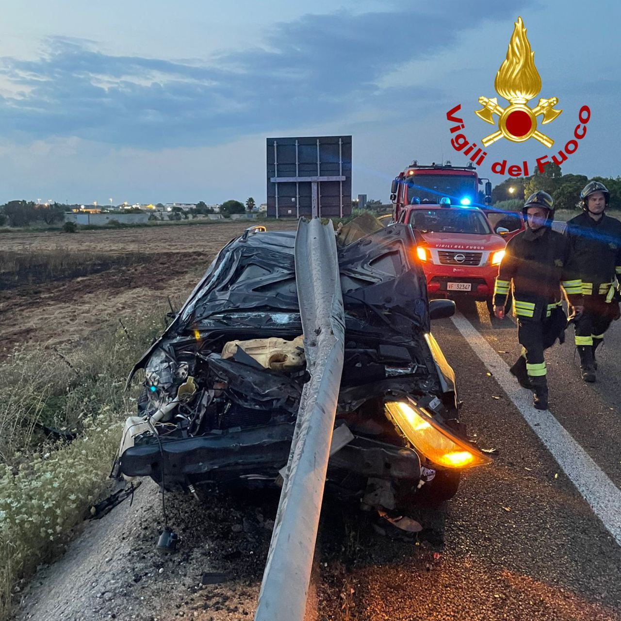 L’auto è stata praticamente distrutta dallo schianto contro il guardrail che, in questo caso per fortuna non ha sfondato il parabrezza e non ha attraversato l’abitacolo.
