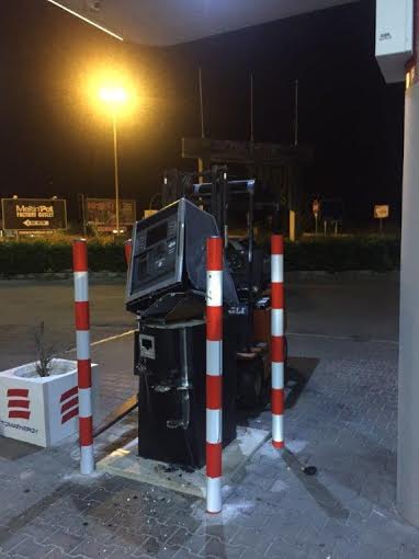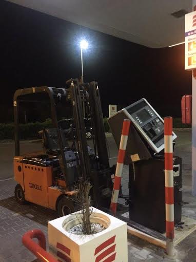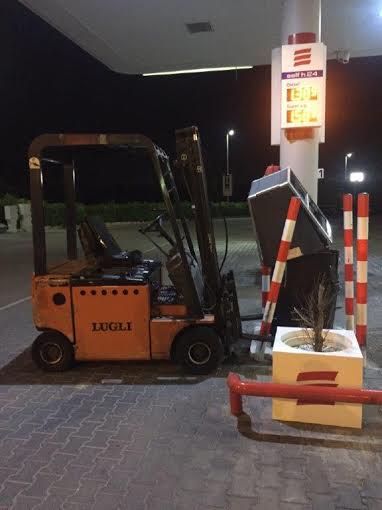 Immediatamente, una pattuglia della stazione di Parabita si è recata sul posto ed ha colto Del Genio nell’intento di divelgere la colonnina self service con un muletto.