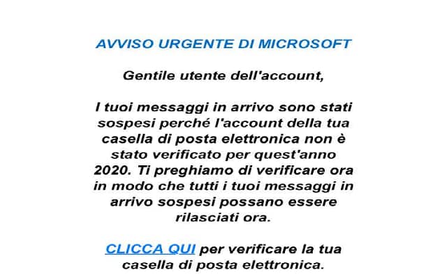 Questa volta il tentativo di carpire illecitamente informazioni personali e dati di carte di credito o di accesso a servizi on line, arriva da mail apparentemente di Microsoft e/o di un mittente istituzionale, con le quali viene invitato l’utente dell’account a cliccare su un link per verificare la sua casella di posta elettronica e rilasciare tutti i messaggi in arrivo sospesi.
