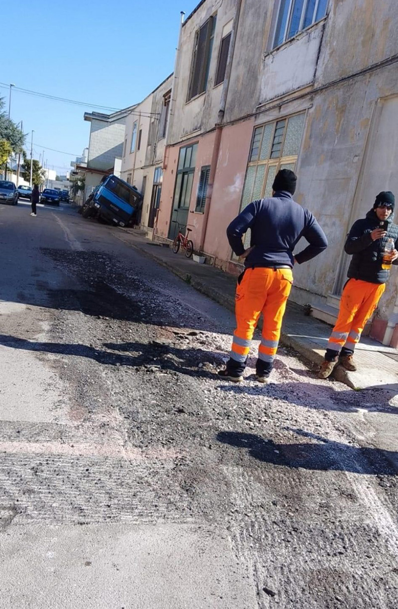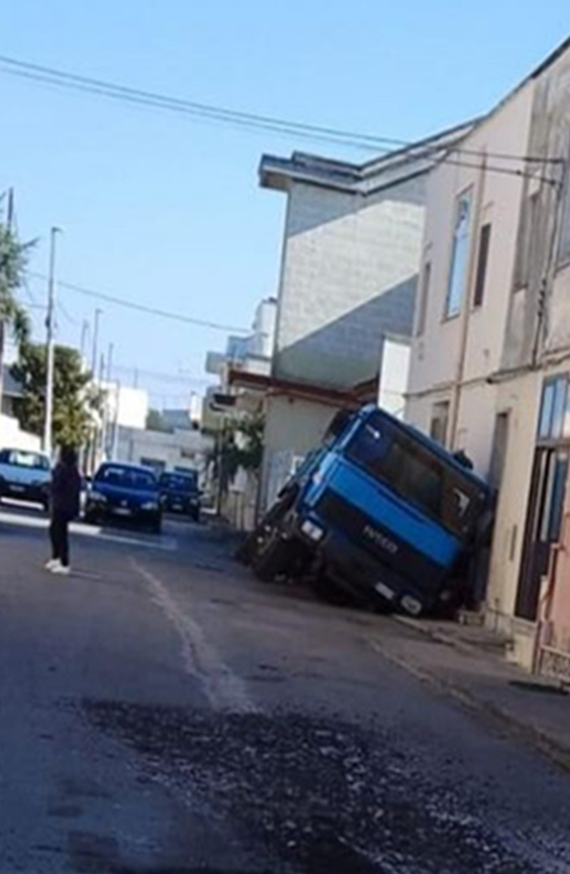 Alcuni operai di una ditta erano intenti ad effettuare dei lavori in via Asmara a Copertino, quando l’asfalto ha ceduto e il mezzo pesante è finito in una grossa buca